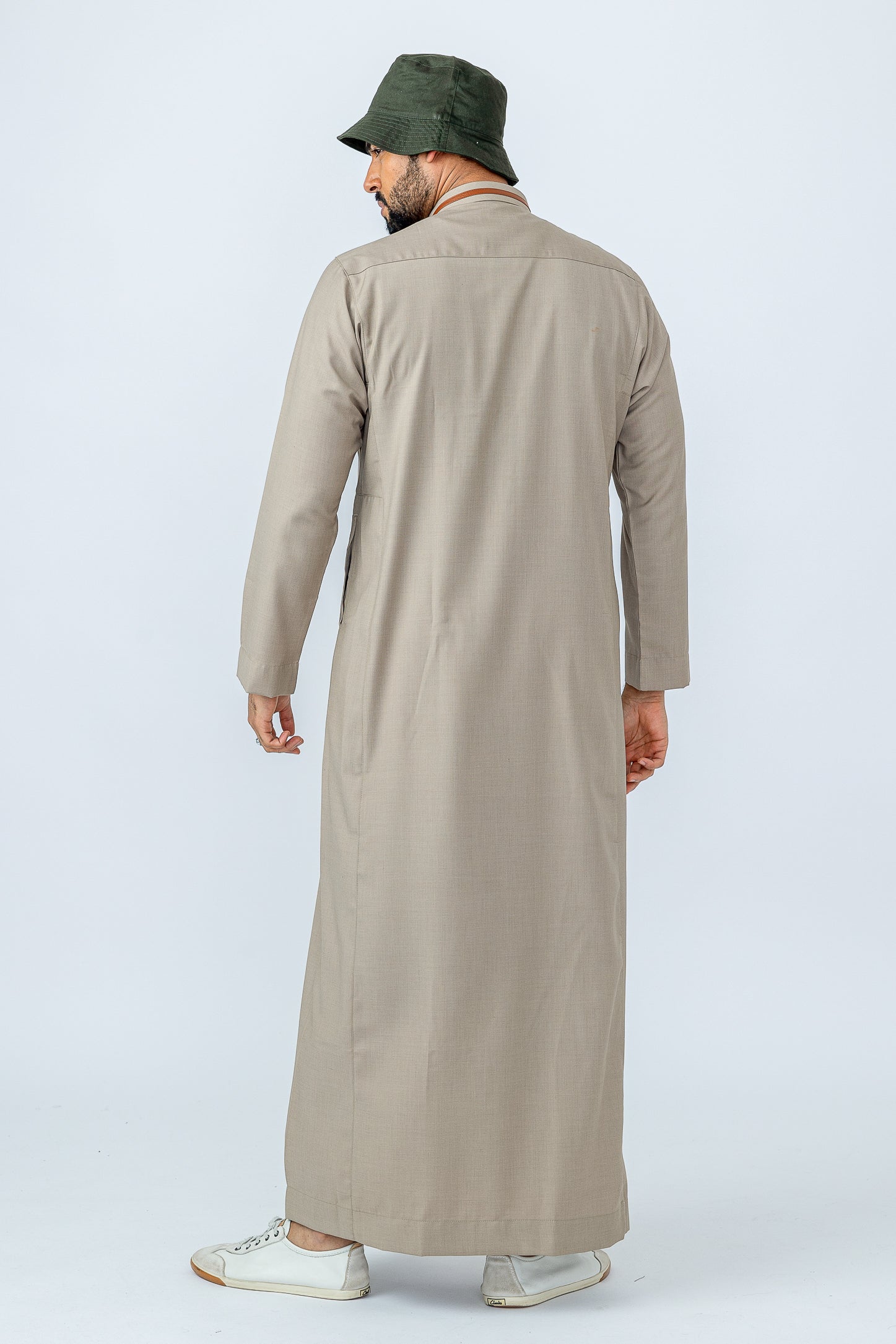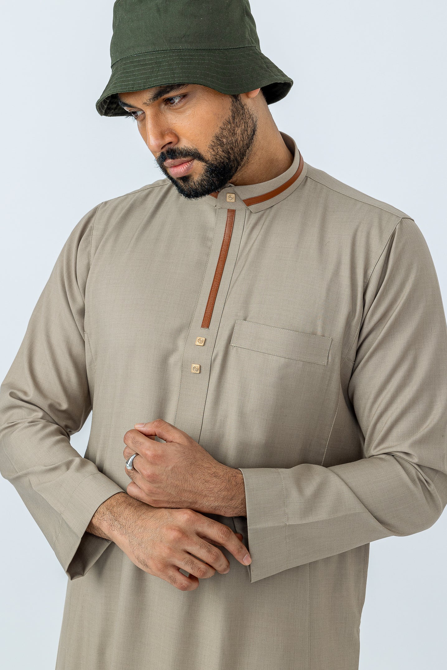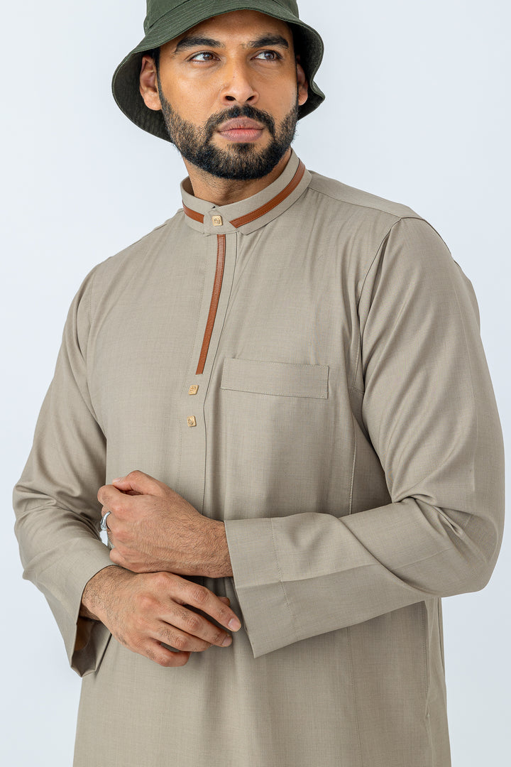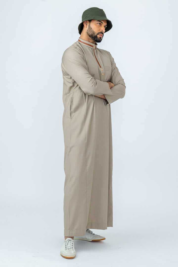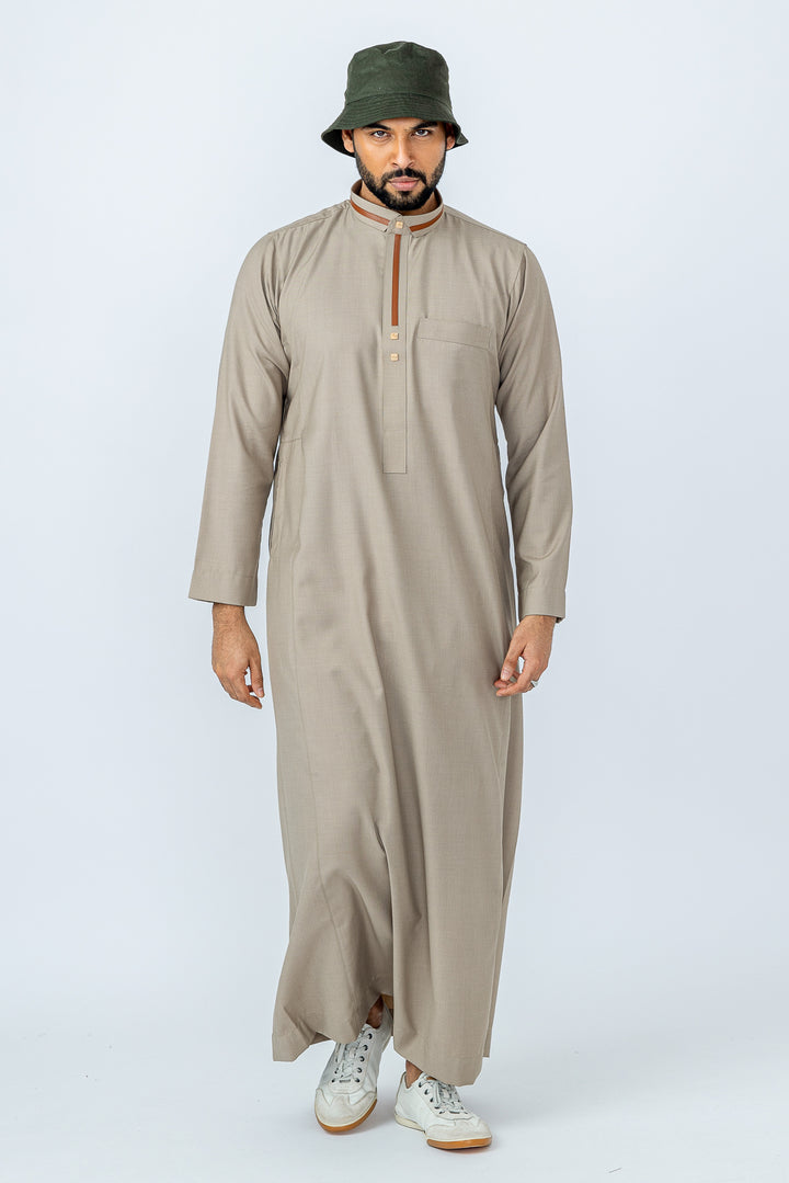 Stay comfortable and look sharp in this 713 Desert Sand Thobe. Crafted from high-quality Polyester fabric and featuring a turn-down collar with a brown leather trim, this thobe is designed for effortless style. With a collared neckline and metal press button opening, you can look great and feel great whenever you wear it.