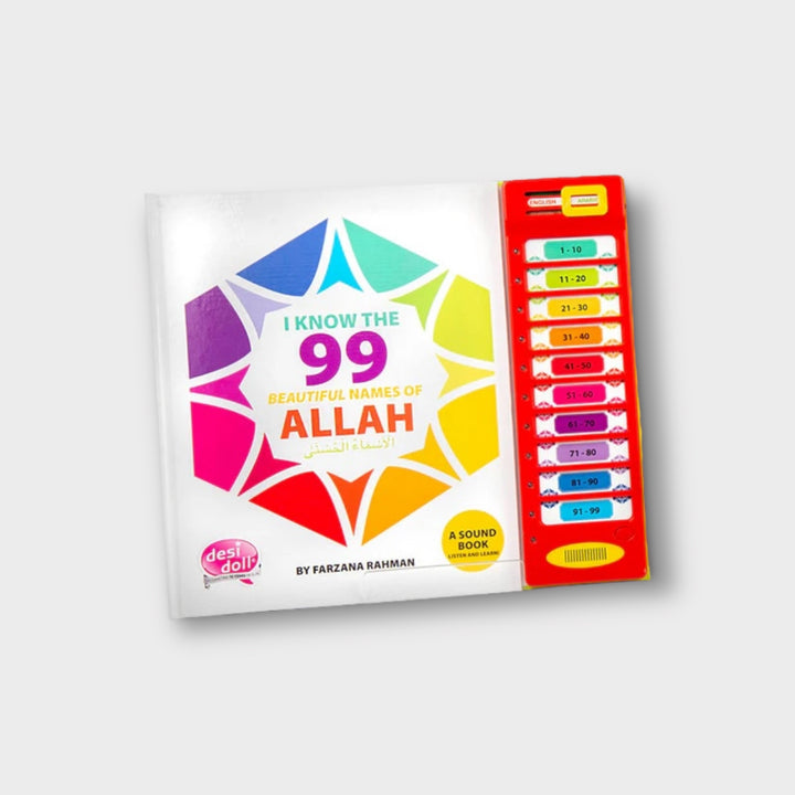 The names are split into easy sets of 10 and recited in a tuneful way to help memorisation. Use the light up sound panel to hear each set, listening and learning and one button at the end that sings all 99 names melodically in one go. Also toggle the sound panel switch to listen to all 99 names in English too.