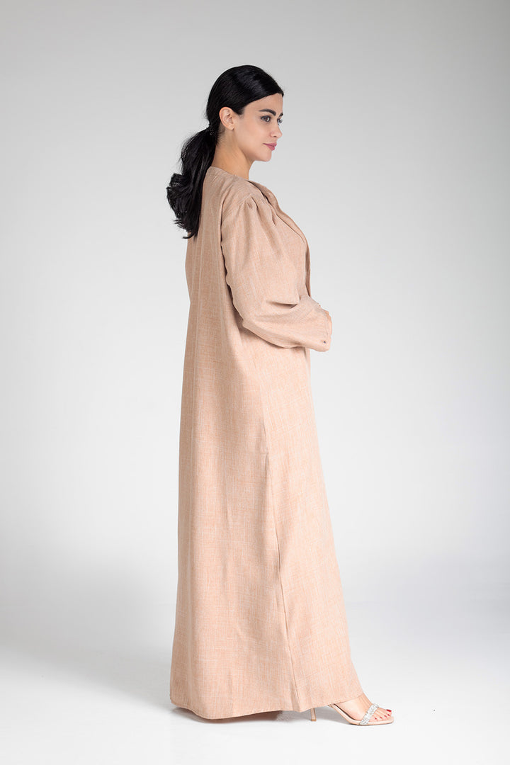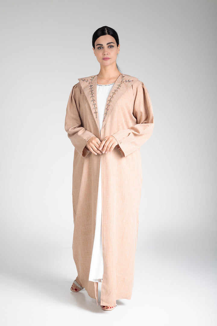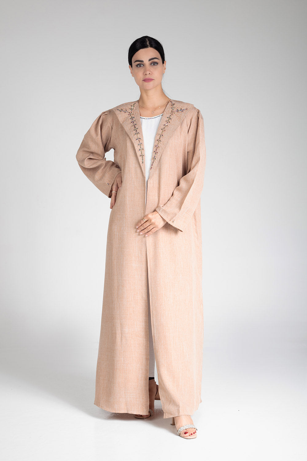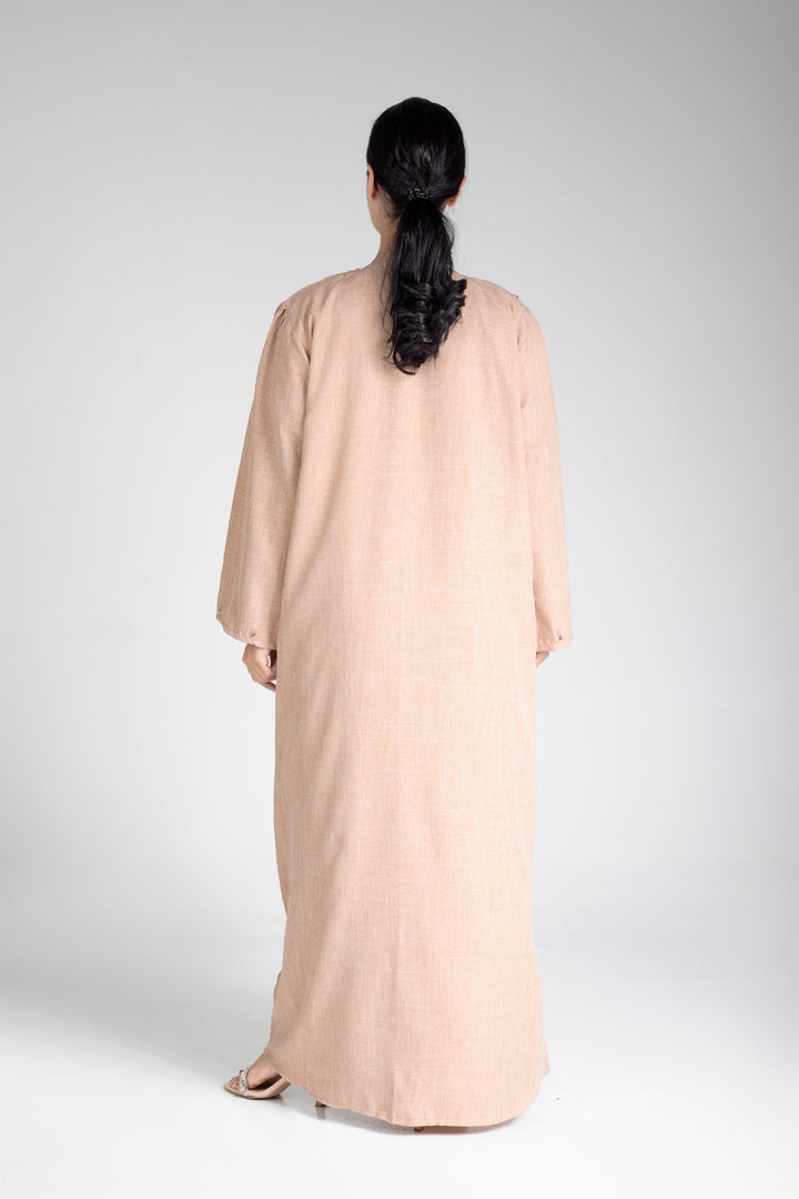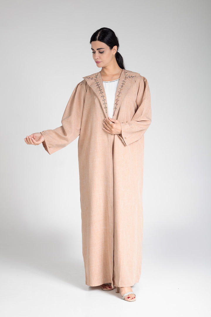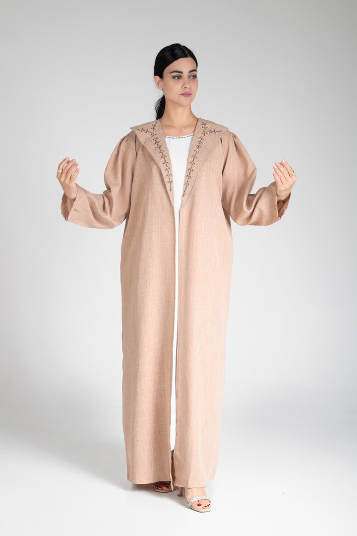 The Desert Sands Abaya embodies elegance with its soft beige tones and refined detailing. Crafted from premium linen, this piece features intricate embroidery along the lapels, providing a subtle yet stunning contrast. The relaxed fit ensures comfort without sacrificing style, making it perfect for both formal events and casual outings. Enhance your wardrobe with this versatile and beautifully designed abaya, a true blend of tradition and modern fashion aesthetics.