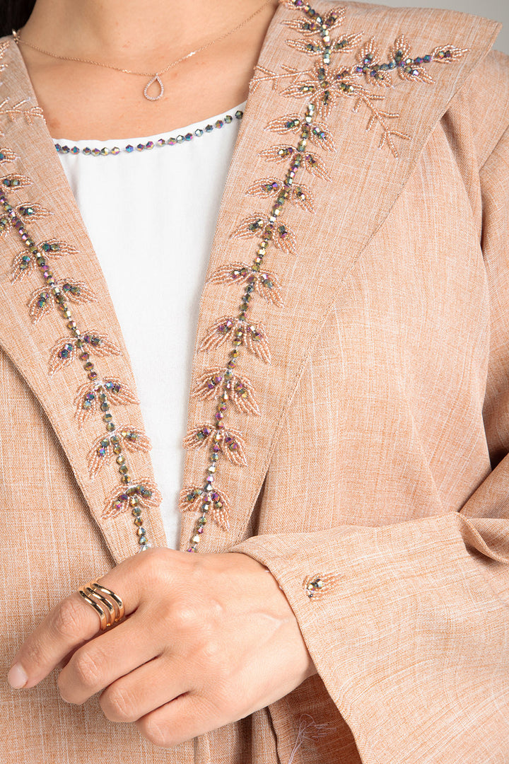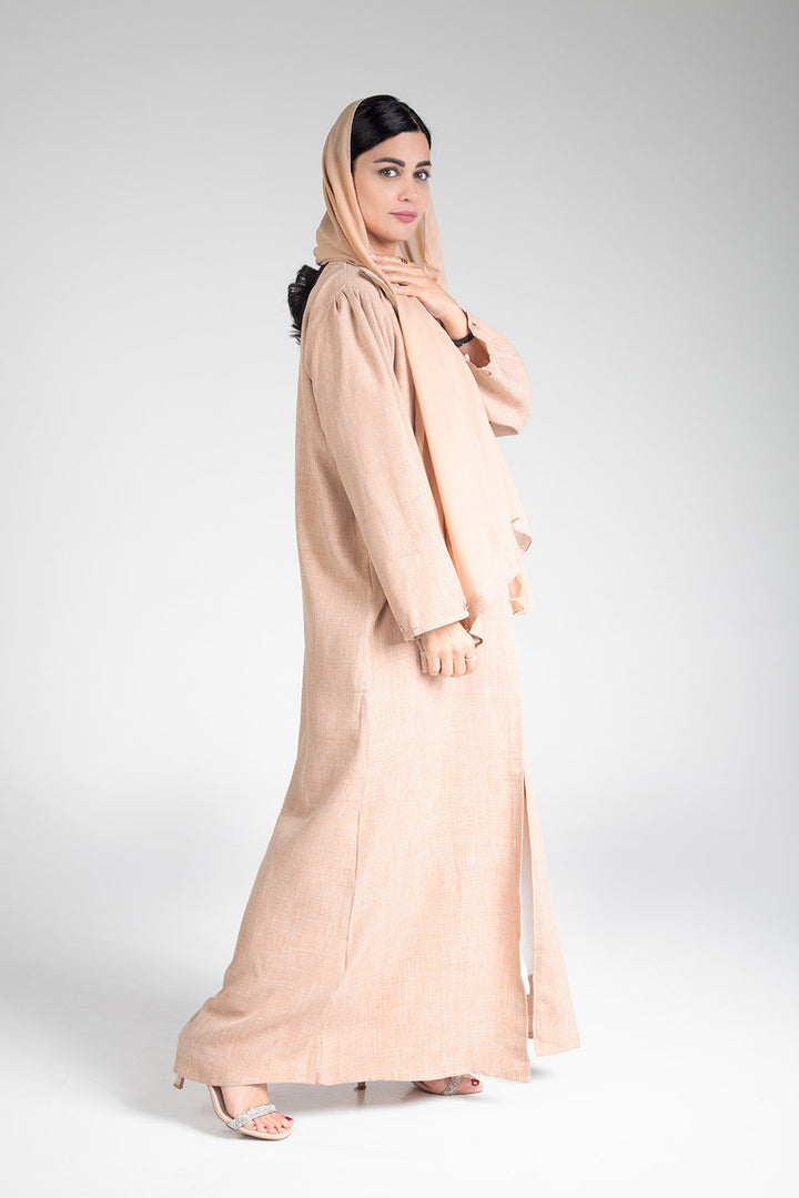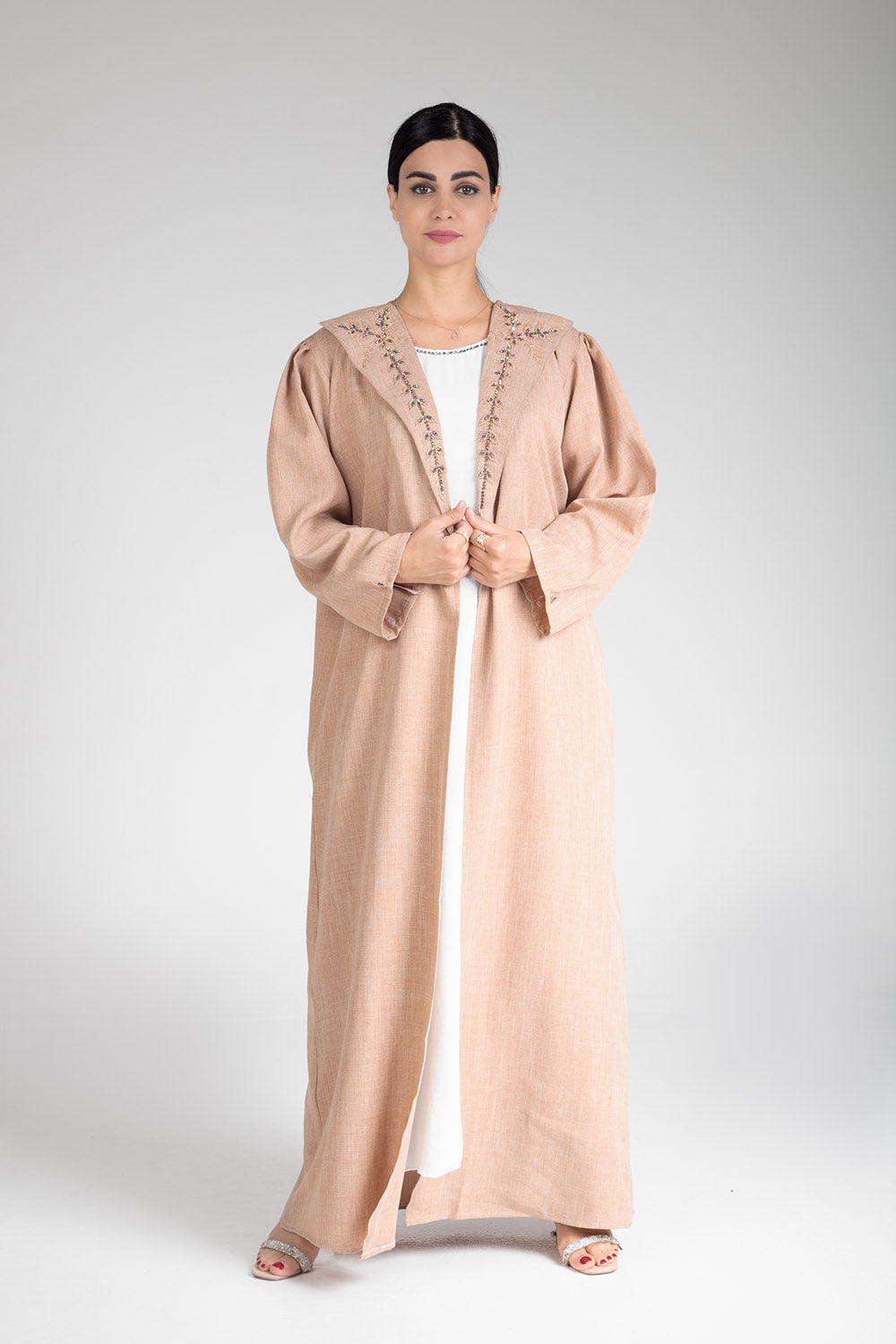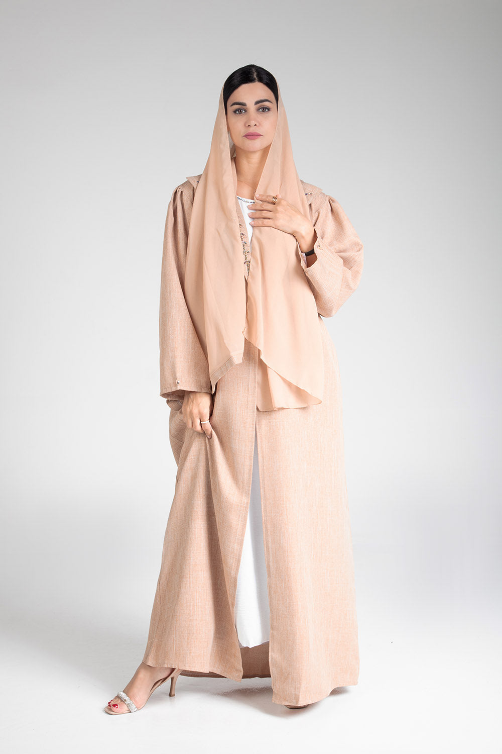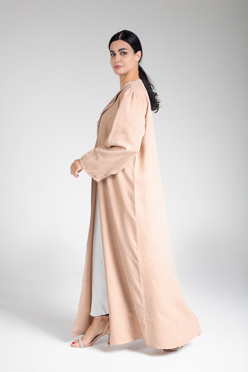 The Desert Sands Abaya embodies elegance with its soft beige tones and refined detailing. Crafted from premium linen, this piece features intricate embroidery along the lapels, providing a subtle yet stunning contrast. The relaxed fit ensures comfort without sacrificing style, making it perfect for both formal events and casual outings. Enhance your wardrobe with this versatile and beautifully designed abaya, a true blend of tradition and modern fashion aesthetics.