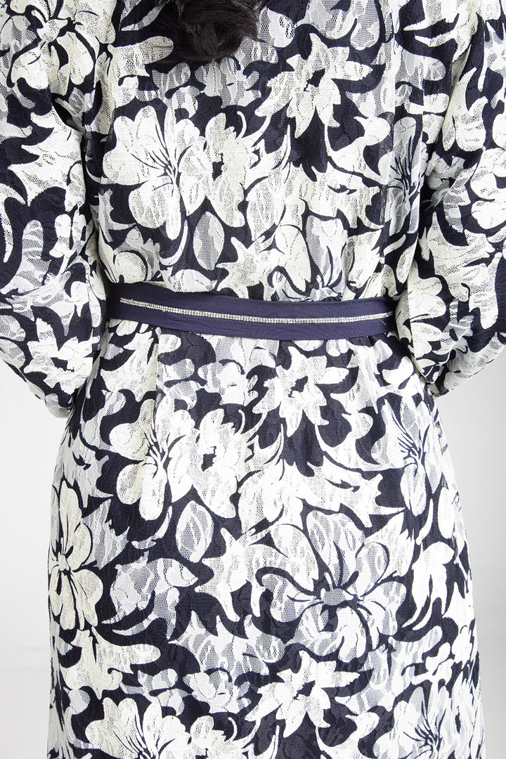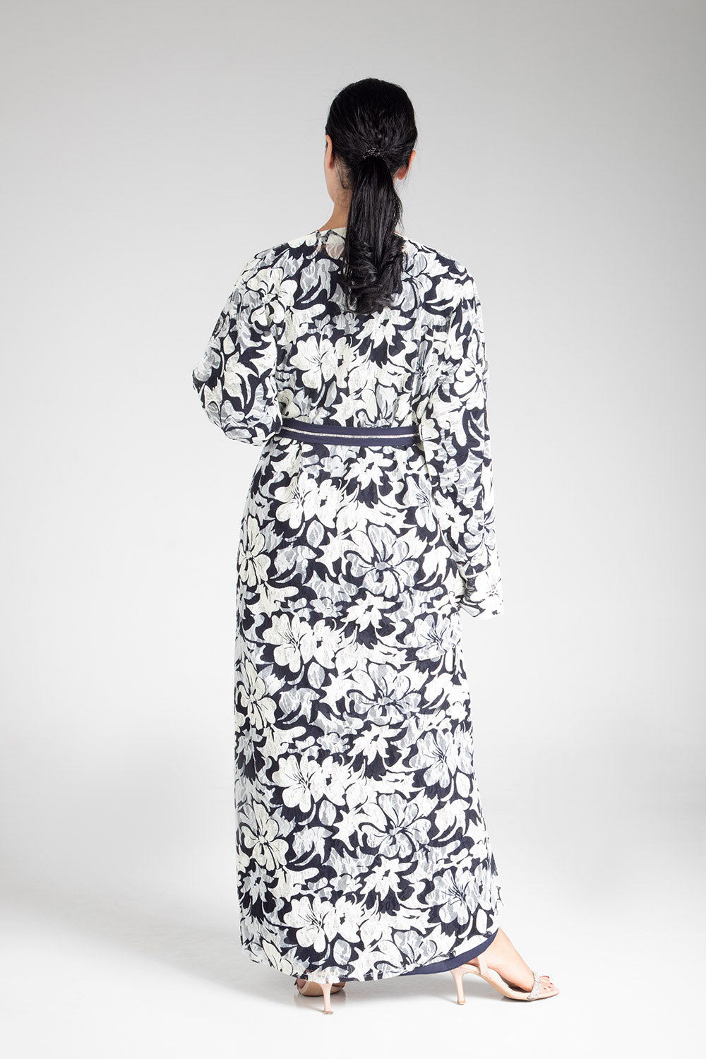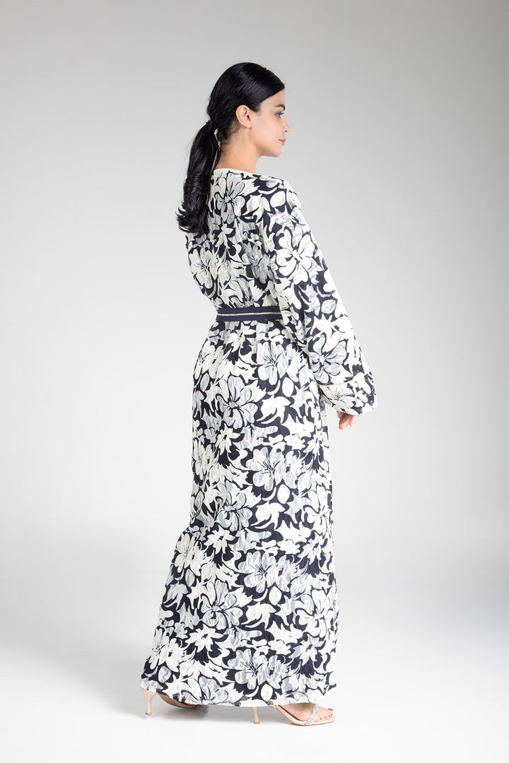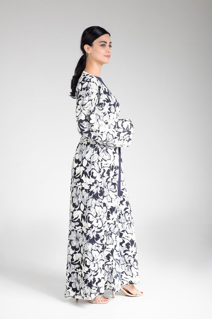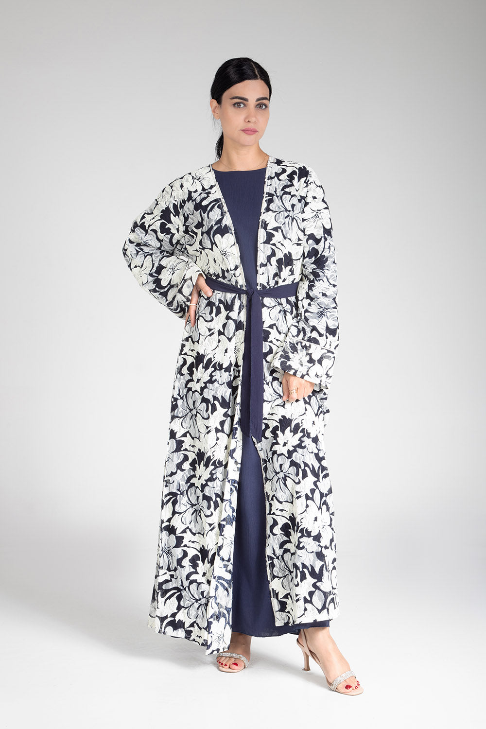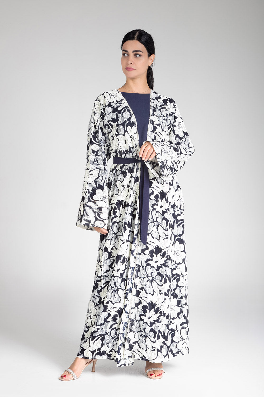 Drape yourself in the elegance of the Floral Cascade Kimono. This exquisite piece features a captivating floral design in classic monochrome tones, enhanced by a contrasting navy blue sash that cinches at the waist for a flattering silhouette. Crafted with light and airy fabric, it offers both comfort and sophistication, making it a versatile choice for both casual gatherings and more formal occasions. The floral cascade motif adds a touch of nature-inspired beauty, perfect for those who appreciate subtle yet striking fashion statements.