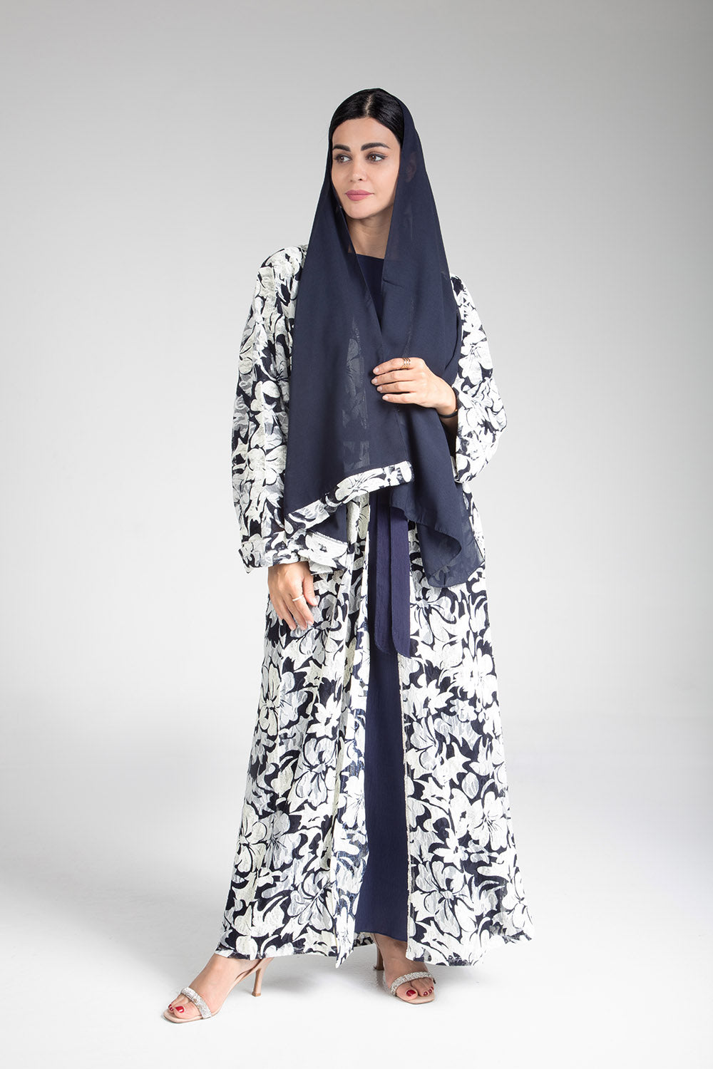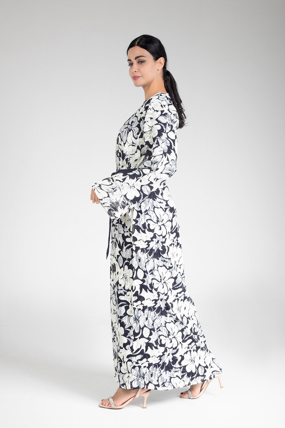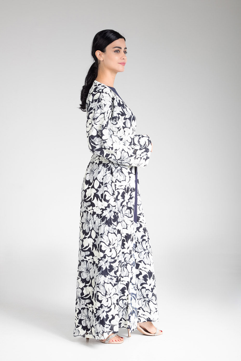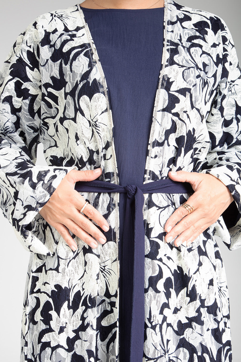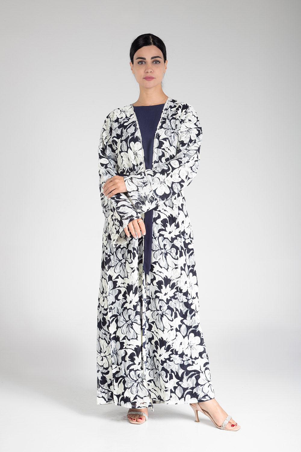Drape yourself in the elegance of the Floral Cascade Kimono. This exquisite piece features a captivating floral design in classic monochrome tones, enhanced by a contrasting navy blue sash that cinches at the waist for a flattering silhouette. Crafted with light and airy fabric, it offers both comfort and sophistication, making it a versatile choice for both casual gatherings and more formal occasions. The floral cascade motif adds a touch of nature-inspired beauty, perfect for those who appreciate subtle yet striking fashion statements.