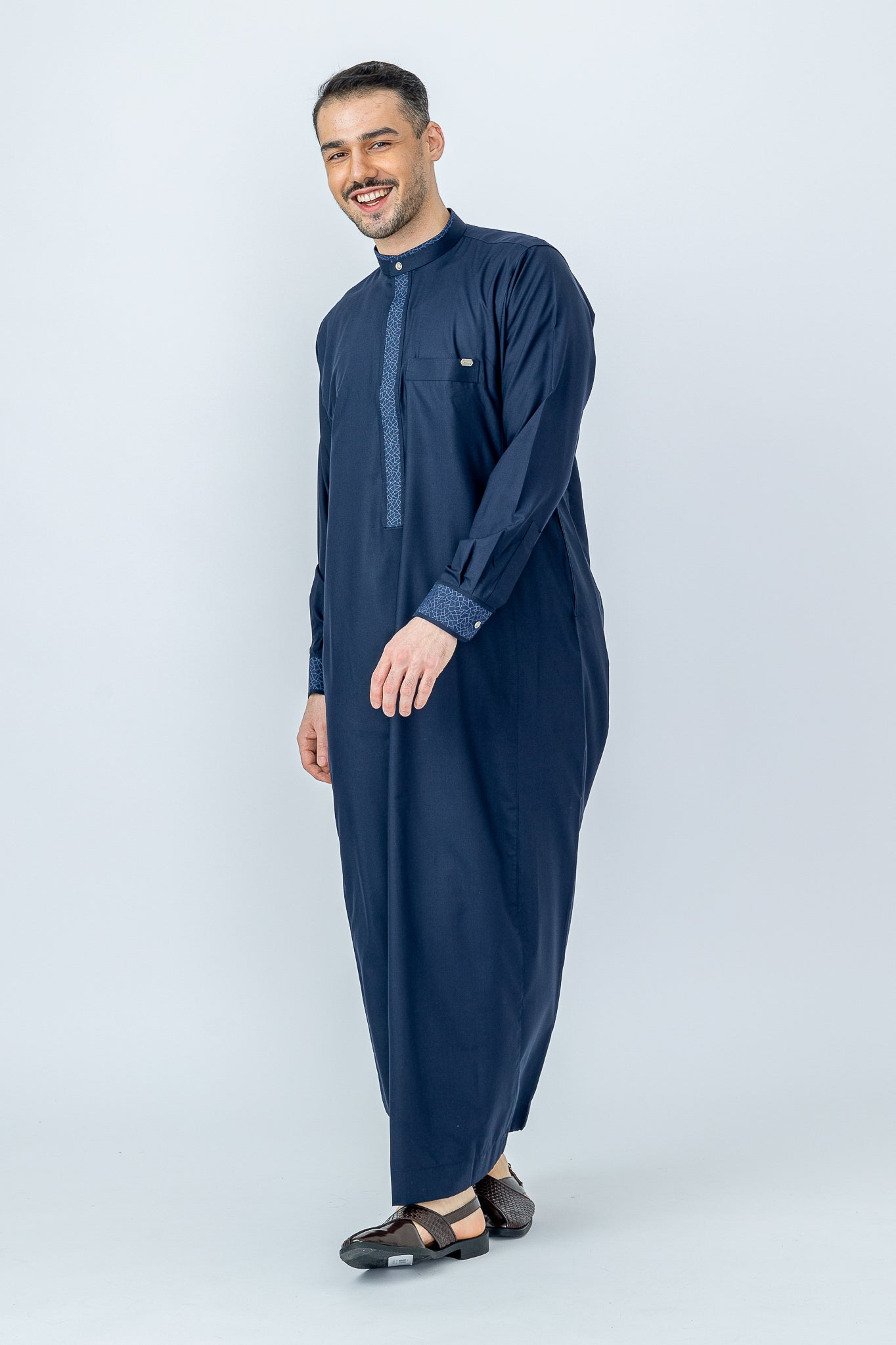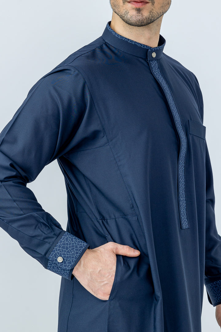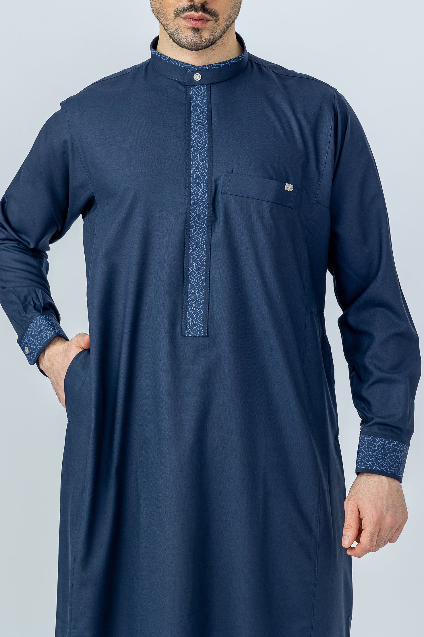 This thobe features an Aztec pattern designed by Al Noor and is crafted from luxurious, soft polyester in a Denim Blue hue. Additionally, the pattern is further enhanced with Al Noor buttons, as well as a zip opening and press buttoned cuffs.