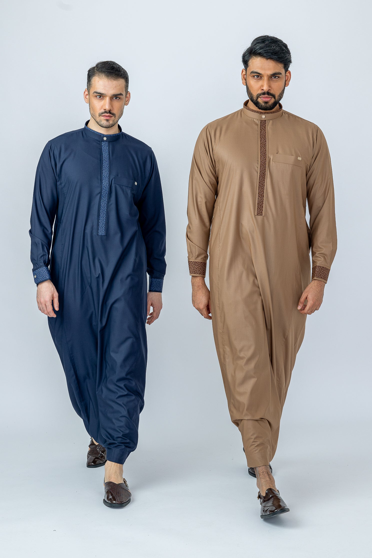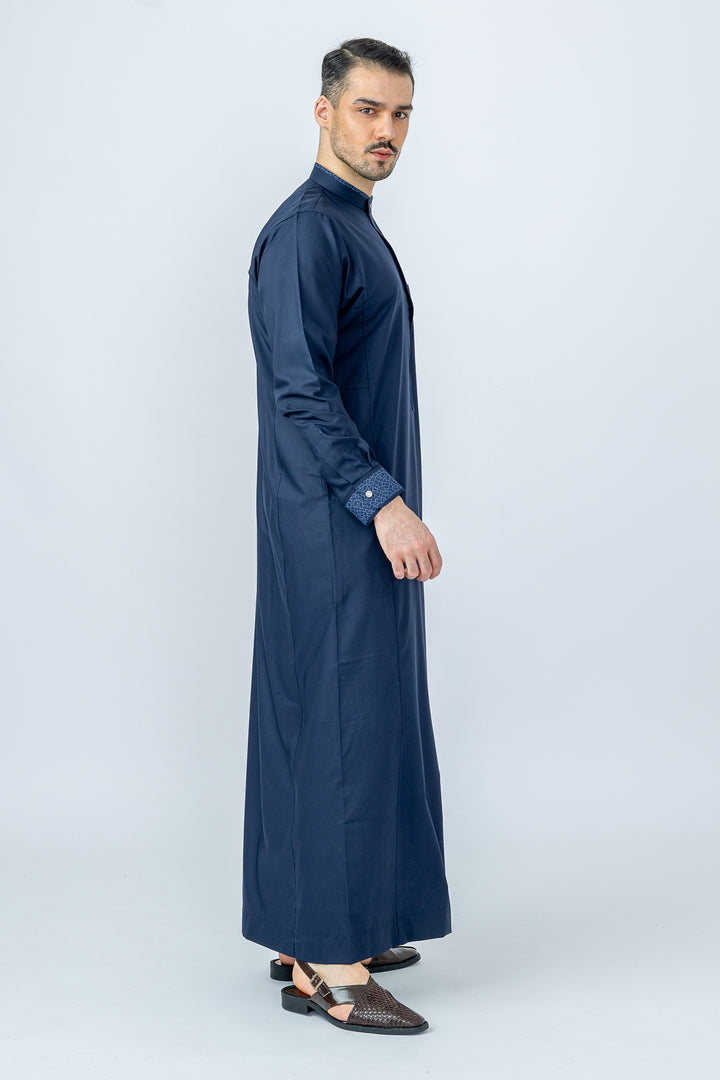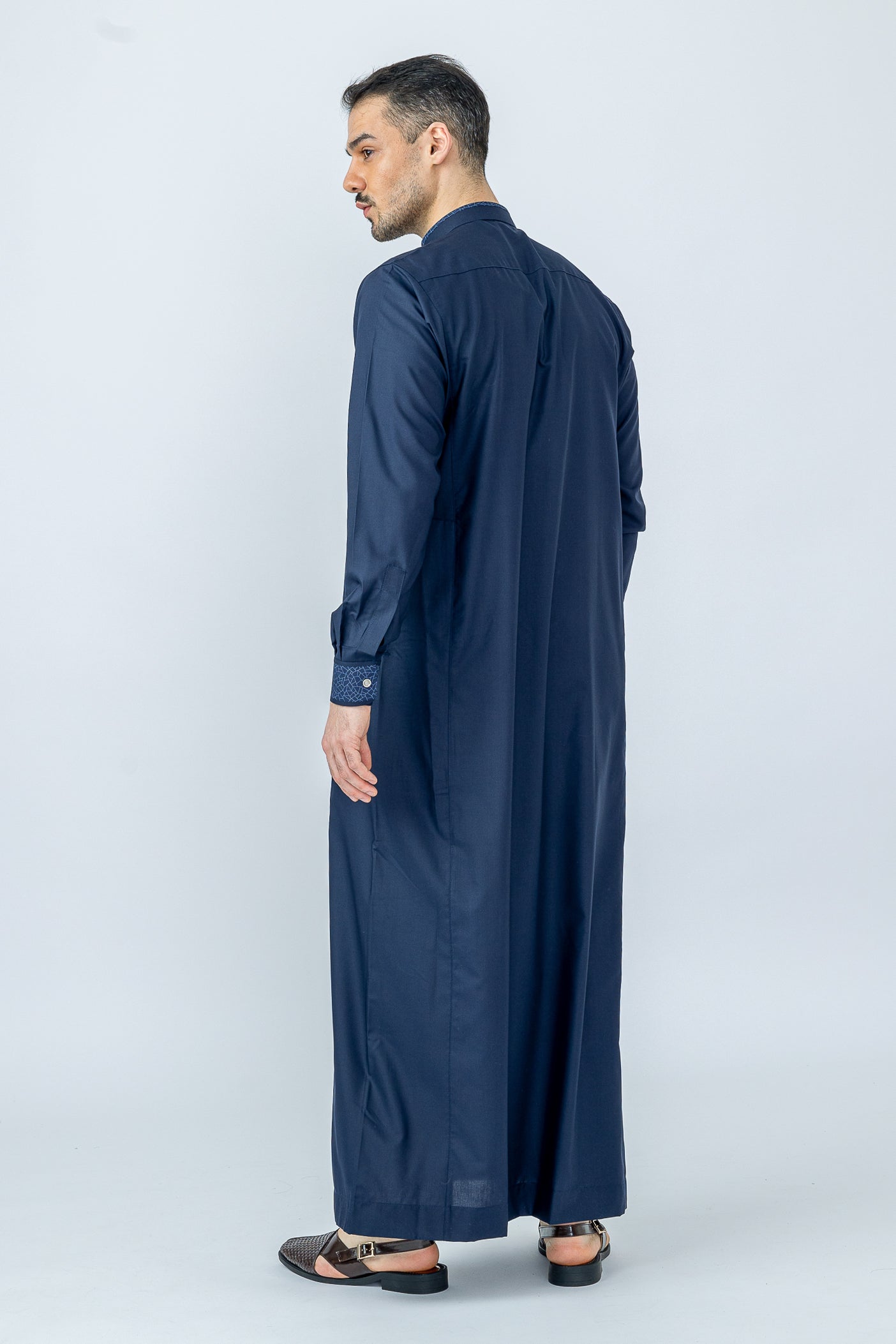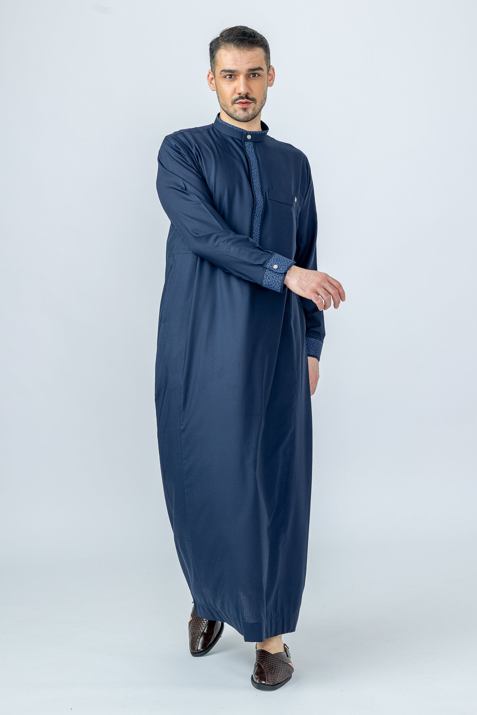 This thobe features an Aztec pattern designed by Al Noor and is crafted from luxurious, soft polyester in a Denim Blue hue. Additionally, the pattern is further enhanced with Al Noor buttons, as well as a zip opening and press buttoned cuffs.