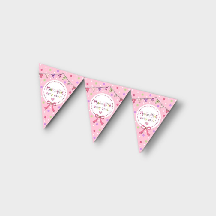 Islamic Moments Masha'Allah New Baby bunting in pink polka dot design is welcoming and vibrant! A fun way to celebrate the arrival of a new baby girl into the family.