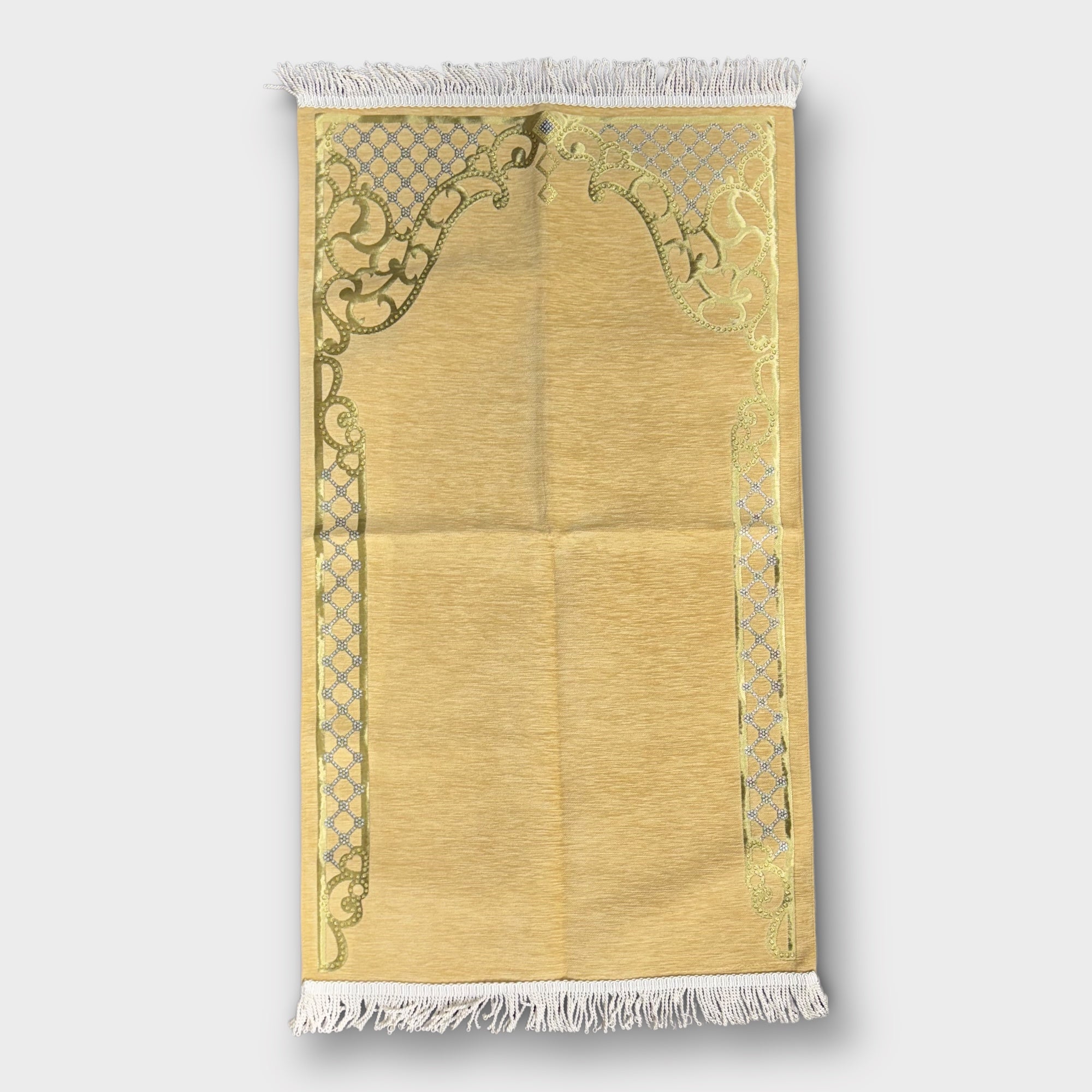 This elegant champagne gold prayer mat exudes warmth and luxury. The base material has a rich, textured appearance that catches the light beautifully. Golden borders create a tone-on-tone effect, with detailed Islamic geometric patterns and flourishing arabesque designs. The mihrab arch is delicately outlined, while the lattice border provides a sophisticated frame. Crisp white tassels complete the refined look.