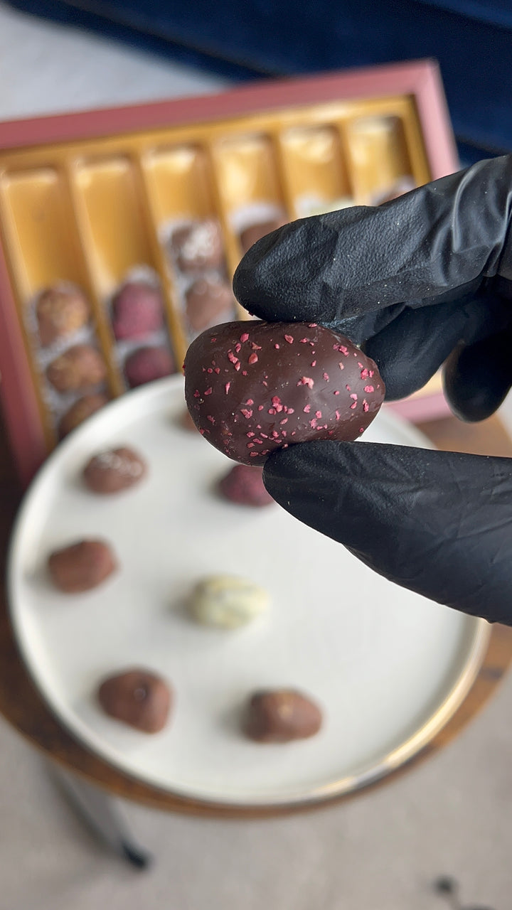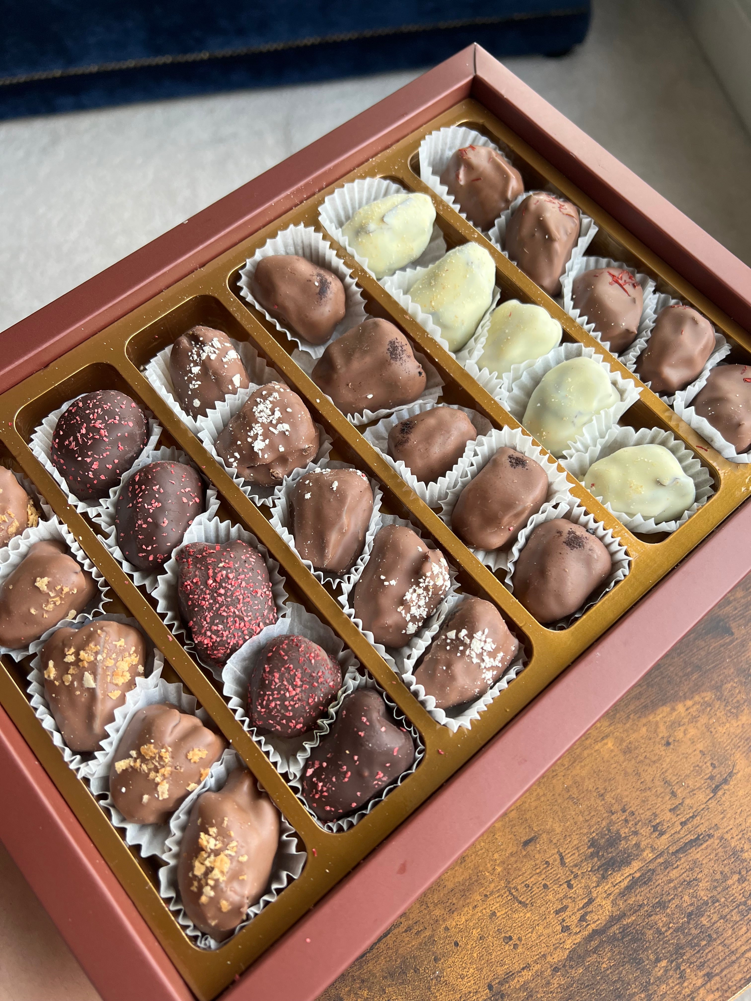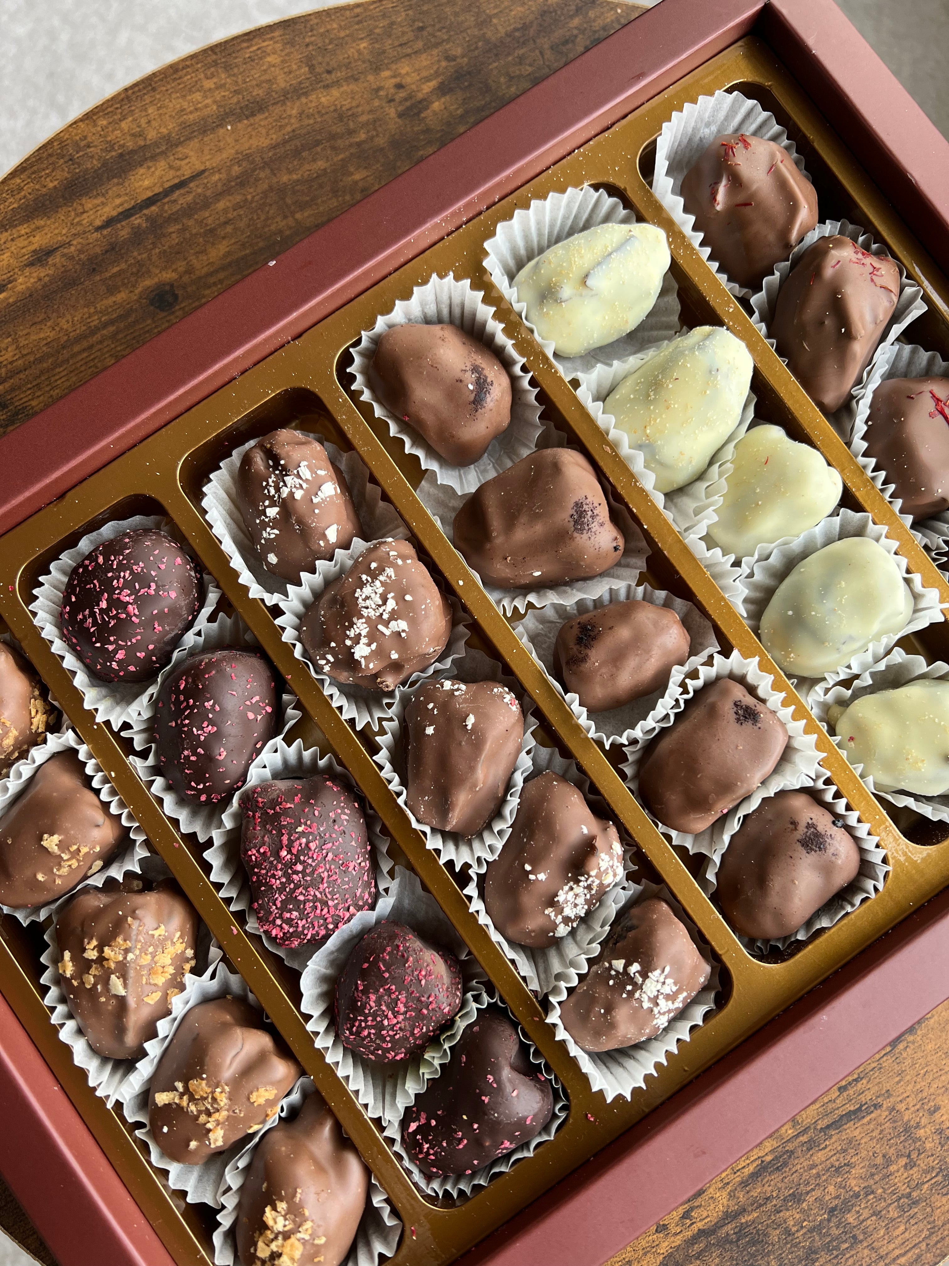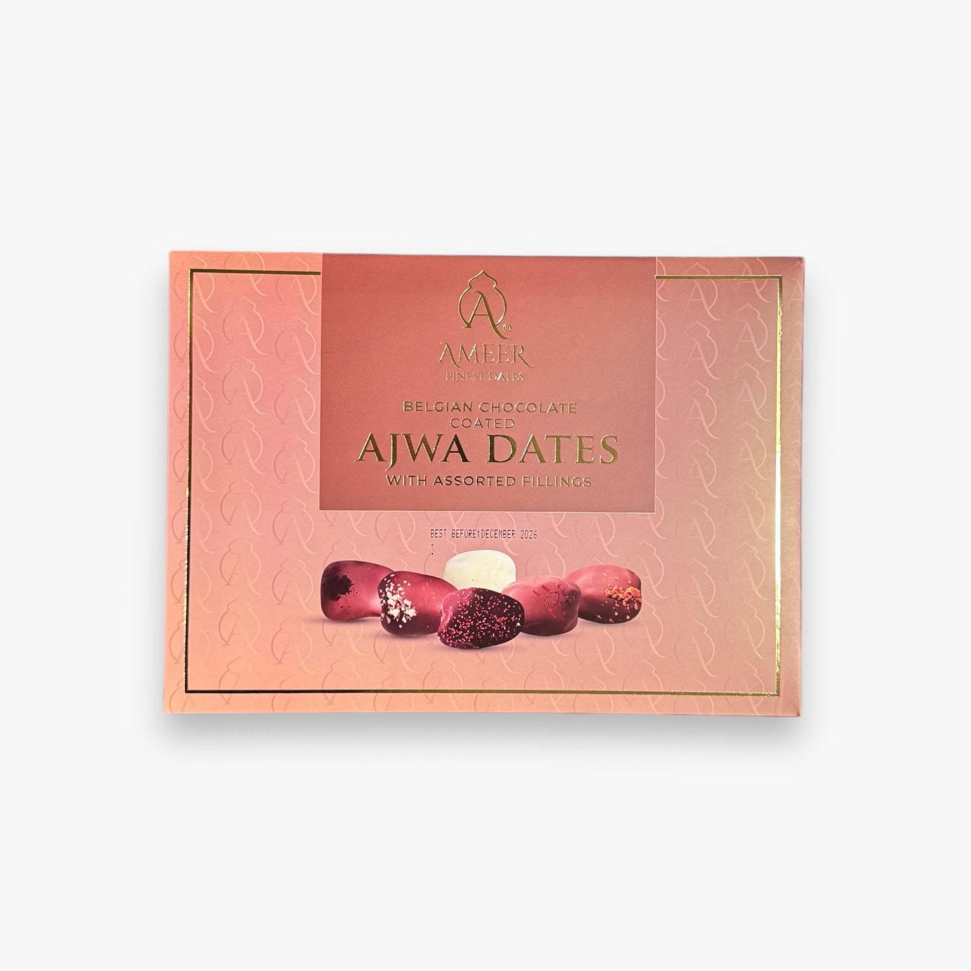 Indulge in the finest fusion of tradition and luxury with our Belgian Chocolate Ajwa Dates, meticulously handcrafted in Madinah. Each premium Ajwa date is enrobed in sumptuous Belgian chocolate and infused with exquisite flavours, creating an elegant treat that honours both heritage and craftsmanship. A sophisticated gift for discerning palates seeking authentic quality with a touch of refinement.
