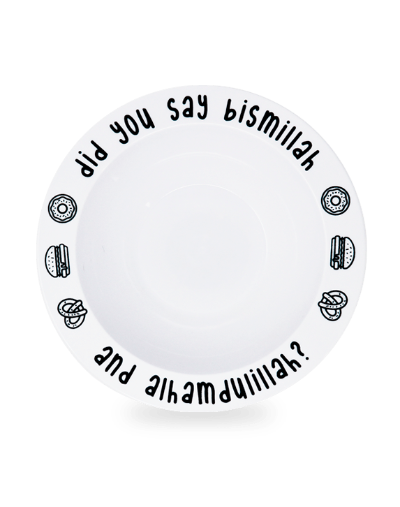 From our Bismillah range of tableware for your mini muslim, this cute bowl has high sides and a large rim to prevent spillages. This stain-resistant and versatile plastic can be used for dinner and picnics alike!