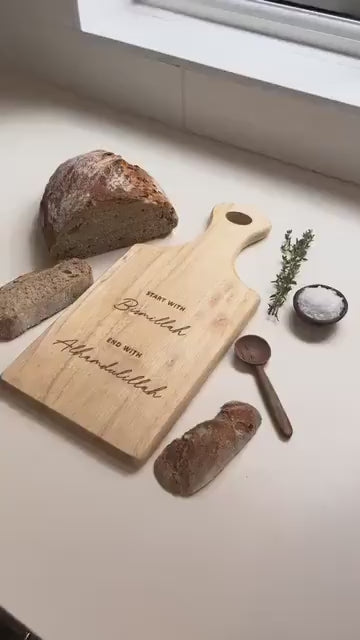 Bring warmth and a touch of faith-inspired charm into your kitchen with this beautifully crafted wooden paddle board. It is thoughtfully engraved with the uplifting Islamic reminder “Start with Bismillah, End with Alhamdulillah,” making it a piece that adds both beauty and meaning to your everyday life.