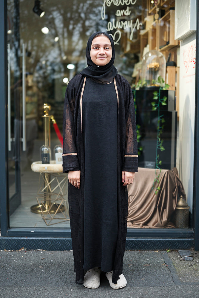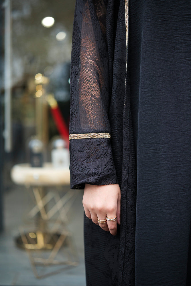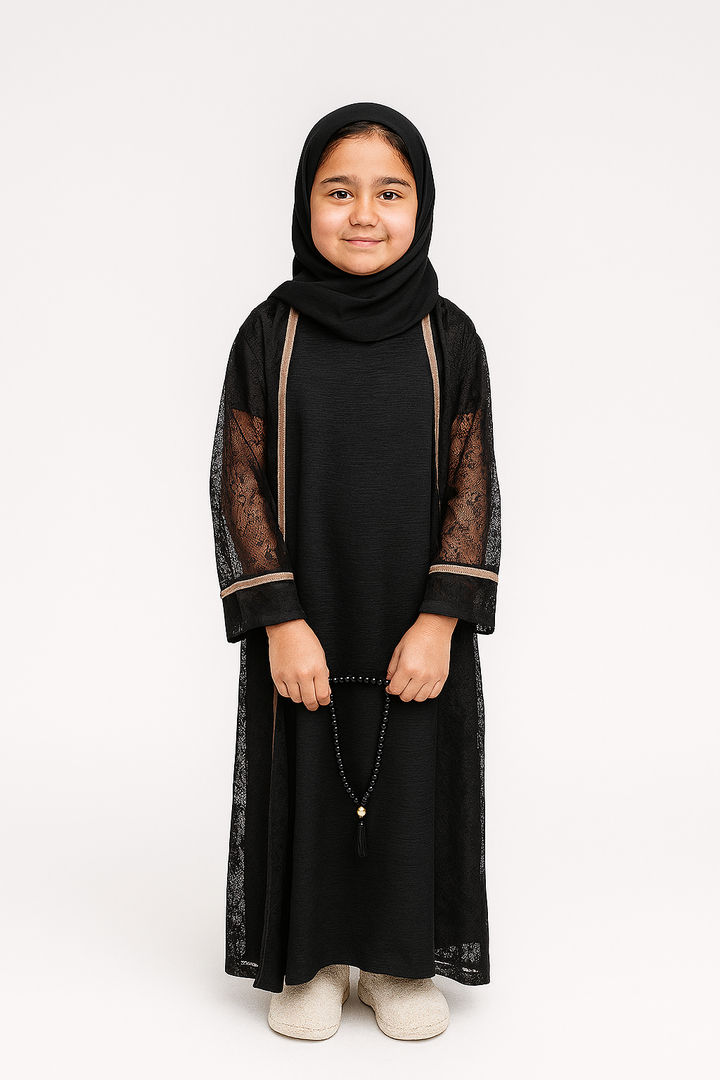 The Girl's Kimono features a stylish Black colour with a patterned netted jacket that adds a touch of elegance. The jacket is adorned with delicate lace and sparkling Diamante details, creating a refined and graceful look. This Kimono comes complete with an inner slip for added comfort and modesty, making it a perfect choice for special occasions or everyday wear. The combination of the intricate lacework and shimmering accents makes this abaya both fashionable and timeless.