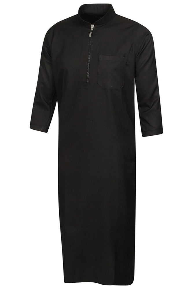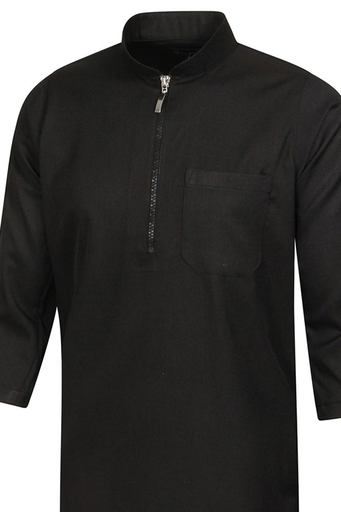 This black plain kids zipper thobe is perfectly designed for both style and convenience. Featuring a zipper closure and three pockets, including two side pockets and one upper left chest pocket, it is made from durable stitched polyester material. Perfect for any occasion, it offers both comfort and functionality.