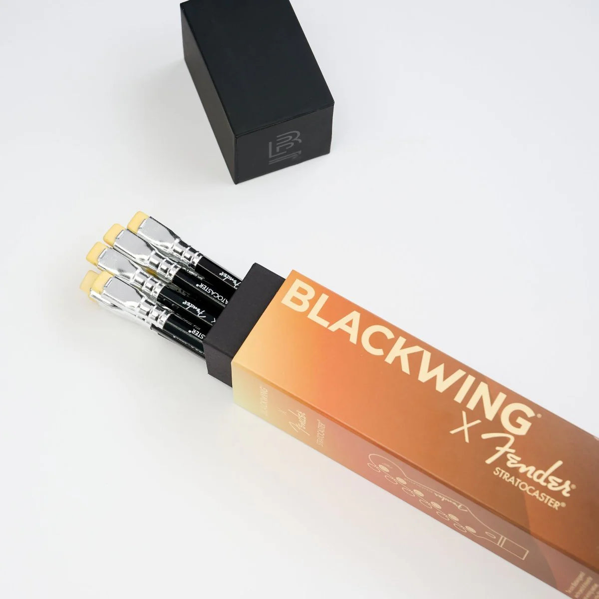 Each set comes with 12 pencils featuring a classic sunburst finish. The opaque black ends of the pencil transition to a transparent middle that reveals the natural wood color below. Each pencil also includes a white Blackwing x Fender Stratocaster imprint, silver ferrule, and our balanced graphite.