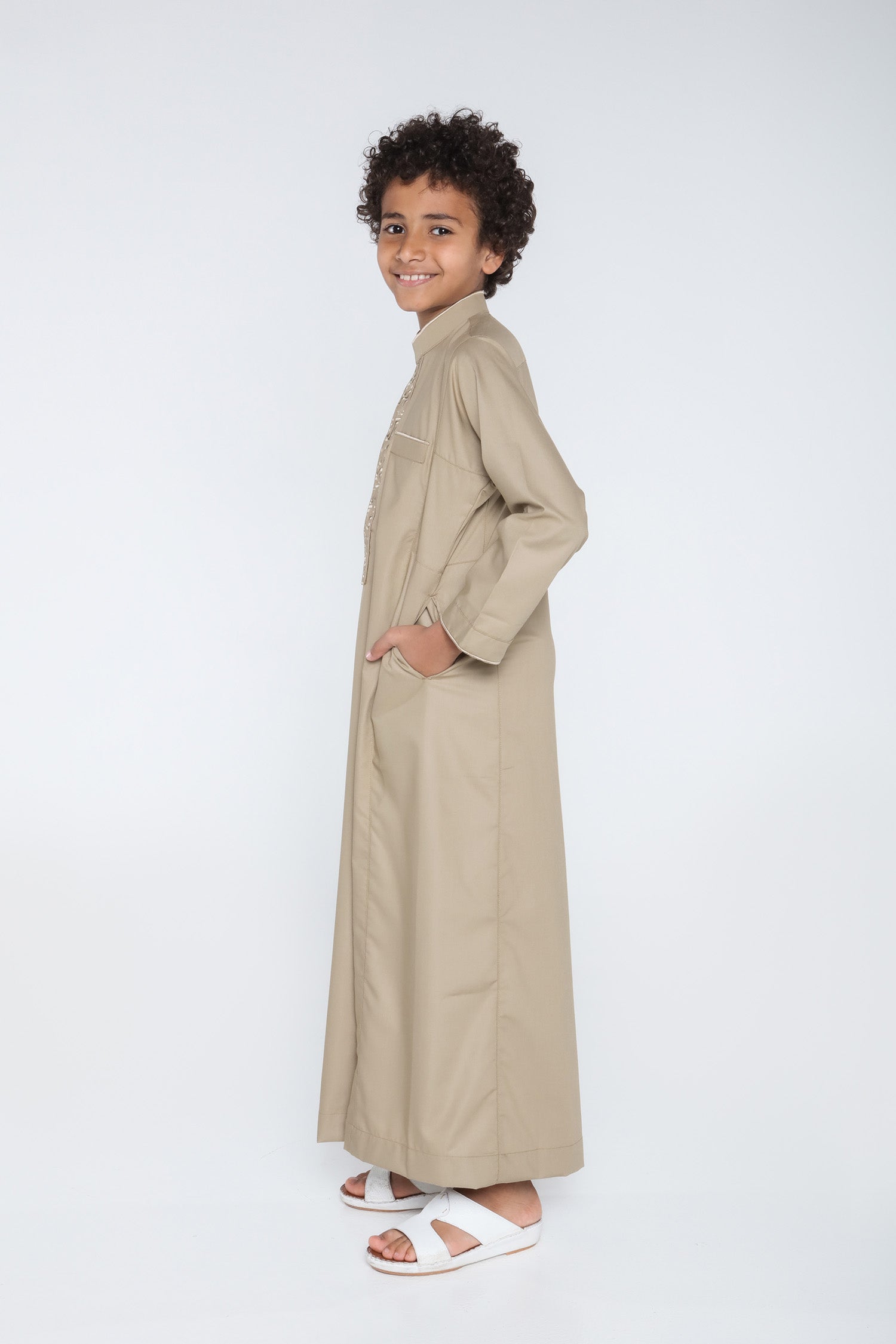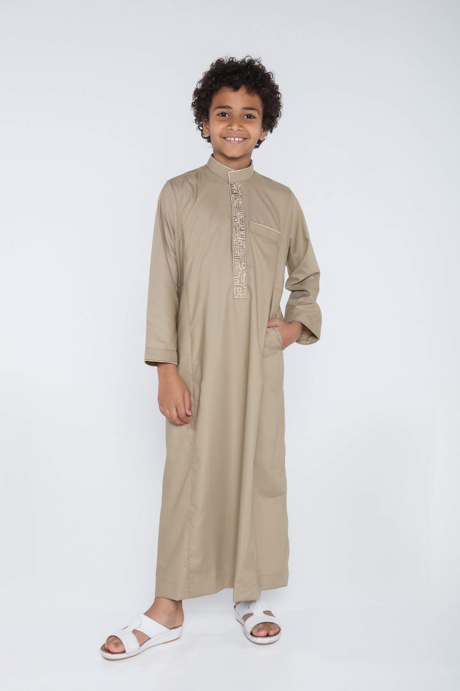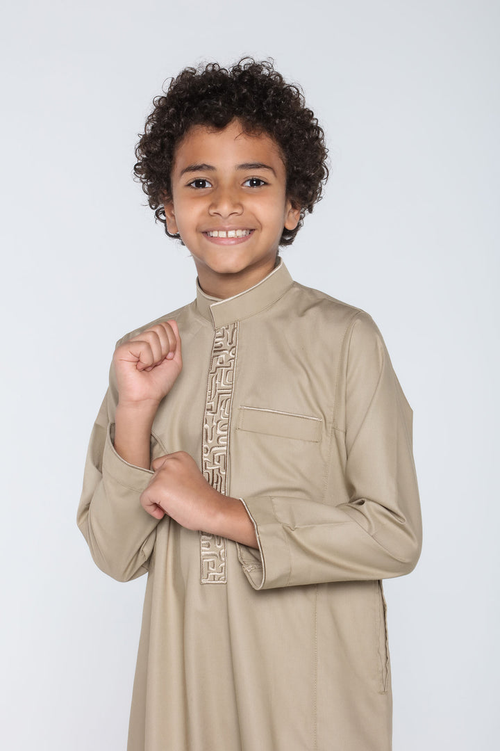 Beige Al Huruf Embroidery Thobe|Jubba features exquisite detail and embossing on the front chest, collar, and cuff, providing an elegant look with meticulous finishing touches. Additionally, this Jubba includes a traditional square hard collar, a front pocket, and two side pockets, with cream/gold being an exclusive colour only available at Jlifestyle by Jubbas.com.