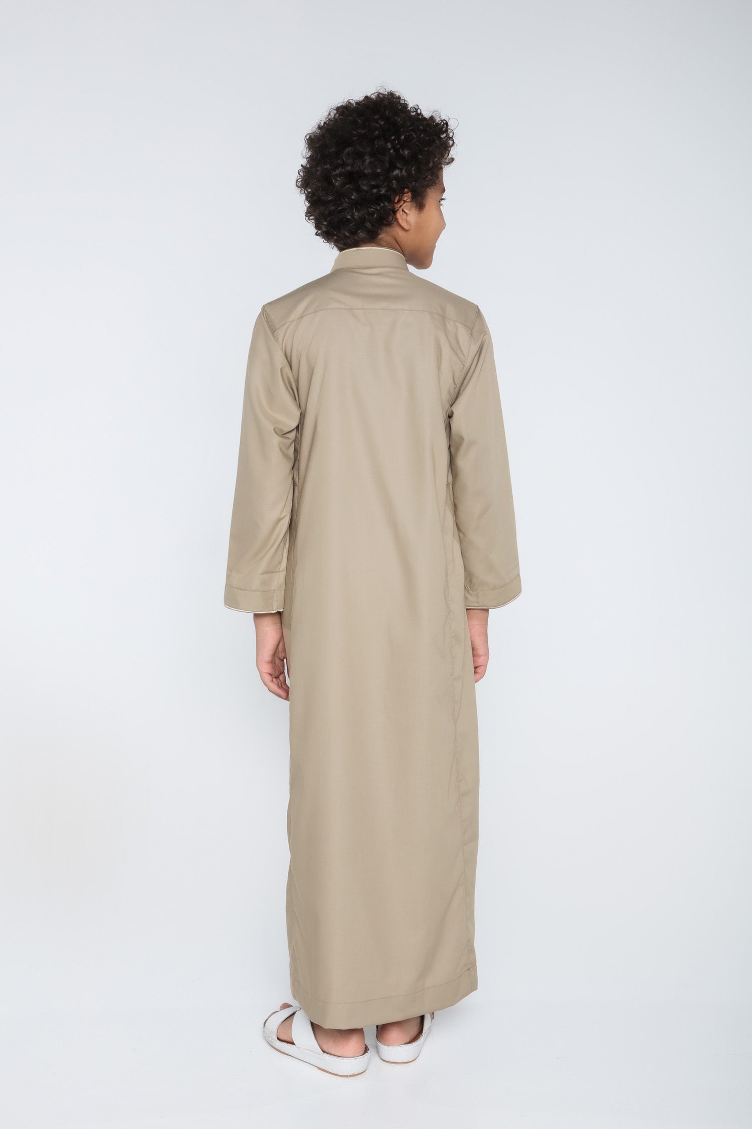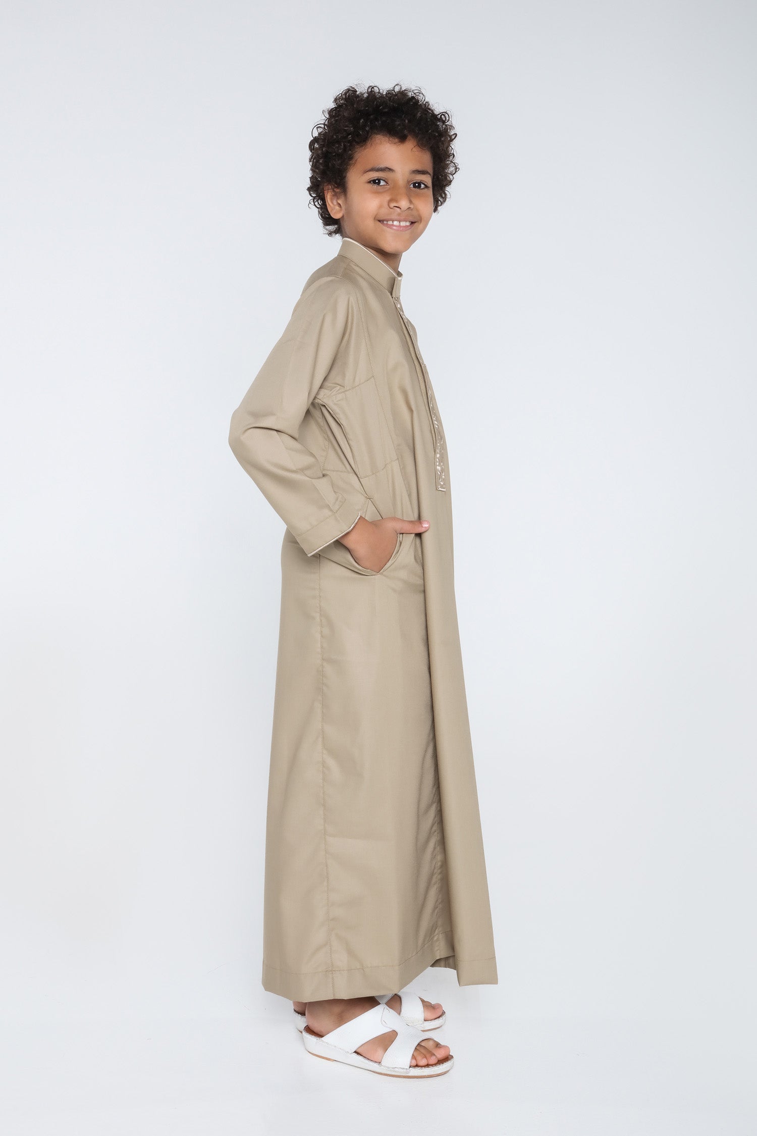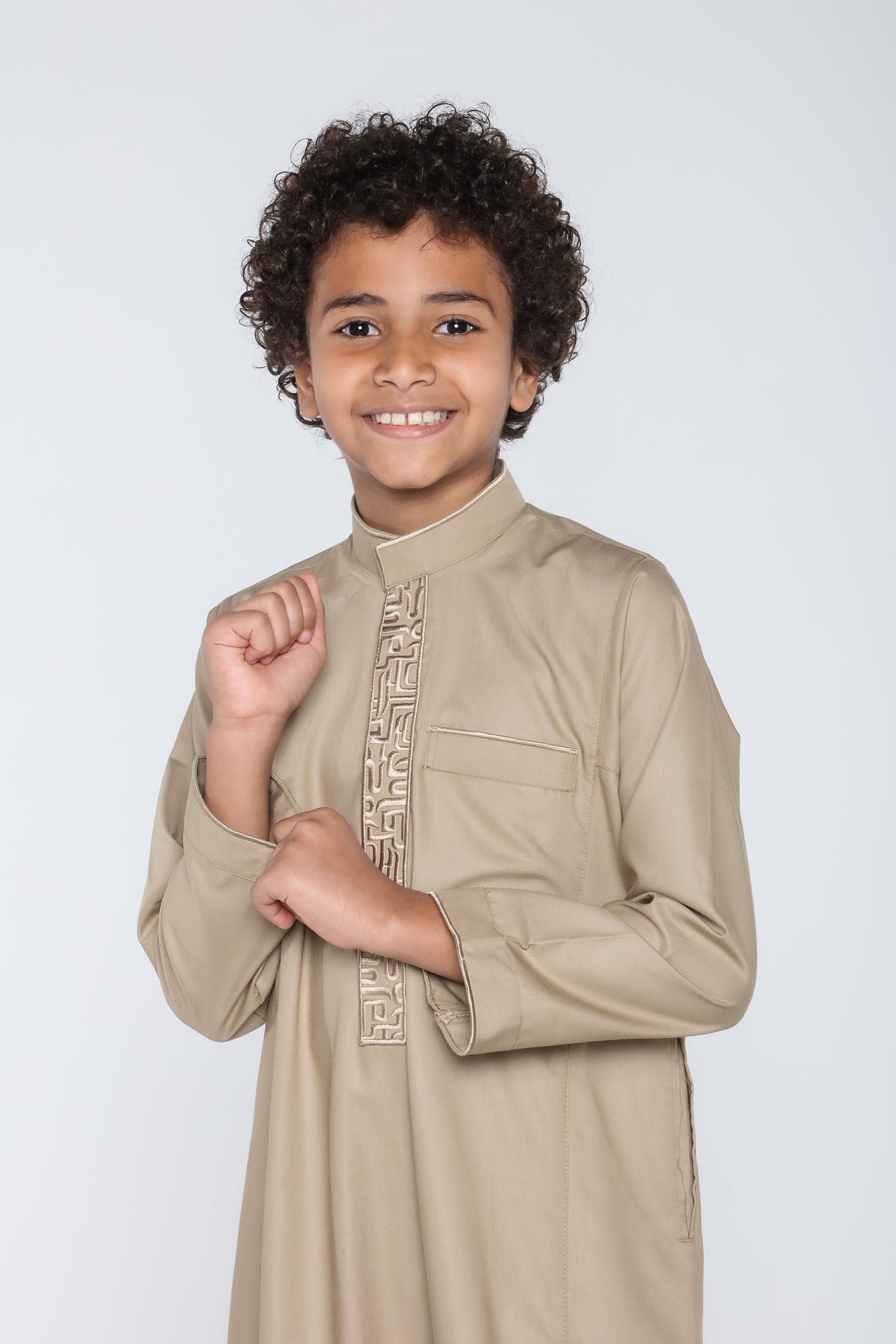 Beige Al Huruf Embroidery Thobe|Jubba features exquisite detail and embossing on the front chest, collar, and cuff, providing an elegant look with meticulous finishing touches. Additionally, this Jubba includes a traditional square hard collar, a front pocket, and two side pockets, with cream/gold being an exclusive colour only available at Jlifestyle by Jubbas.com.