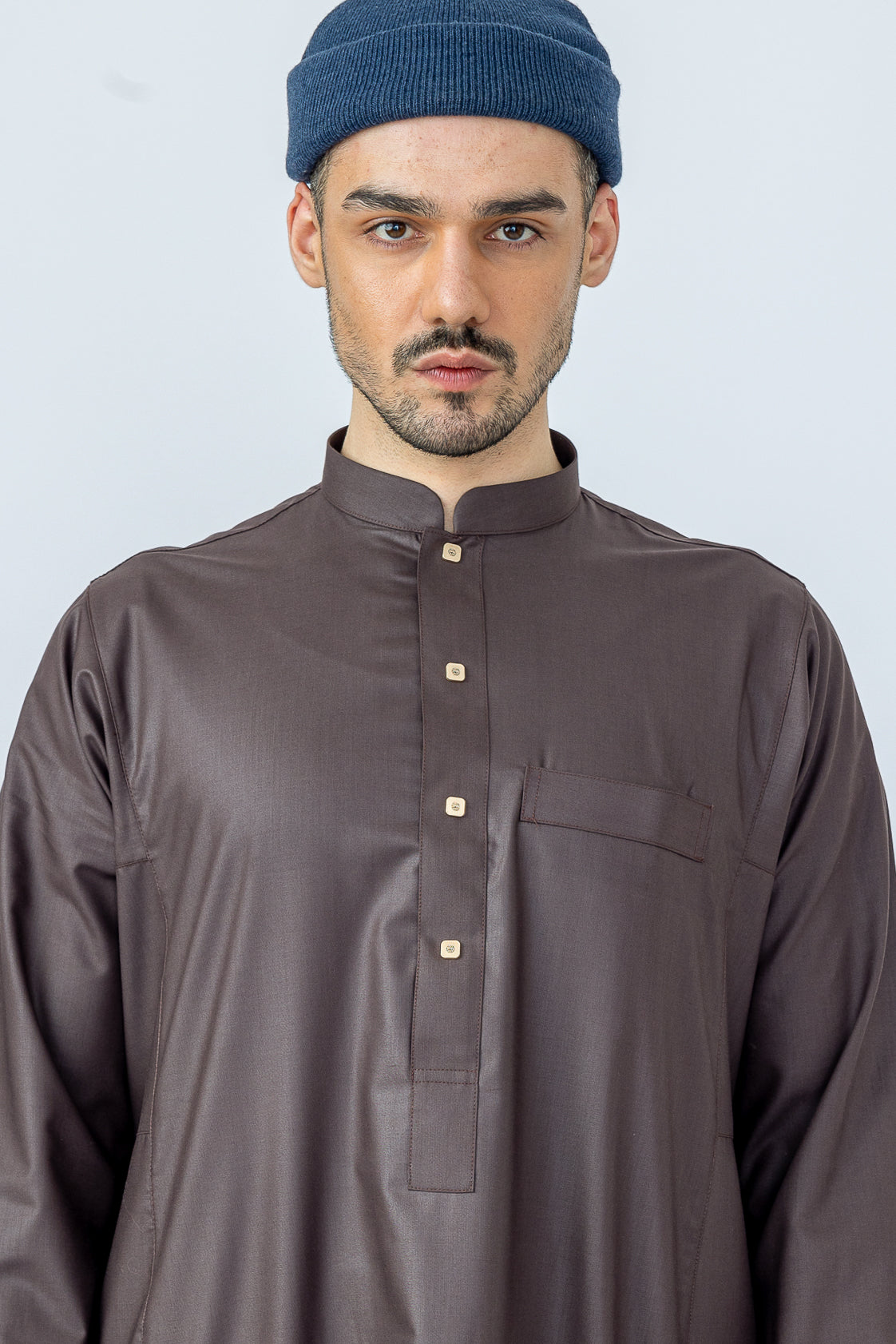 Our Brown Arab Collar is part of our Al Noor Collection, perfect for everyday wear. Its simple design is carefully crafted with a soft split collar, metal press buttons, and soft polyester fabric. It also features two side pockets and a left chest pocket to store your belongings. Experience the comfort of our Brown Arab Collar.