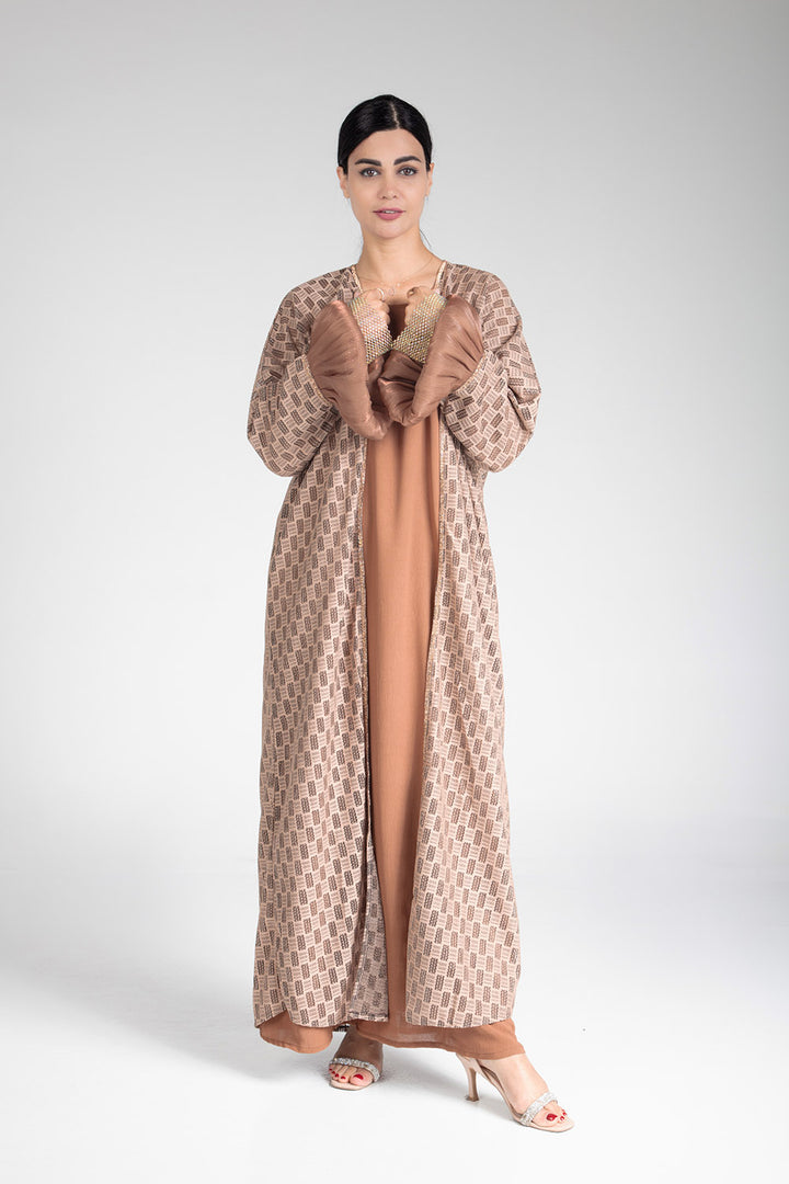 Elevate your wardrobe with the Textured Elegance Abaya, a perfect blend of sophistication and modesty. Featuring a unique patterned fabric and statement puffed sleeves adorned with intricate embellishments, this abaya is designed to make you stand out effortlessly. The neutral tones make it versatile for any occasion, whether casual or formal. Experience comfort and style in one elegant piece.