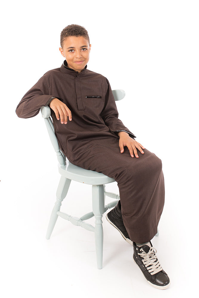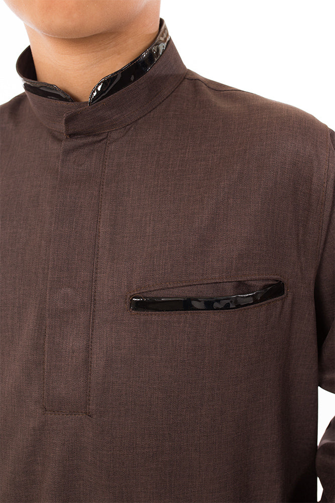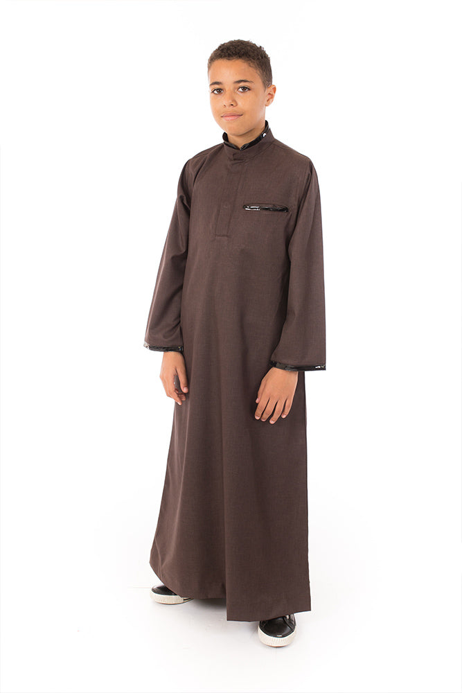 - Brown thobe with a trim of Leather material around cuff and pocket