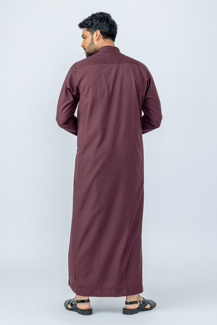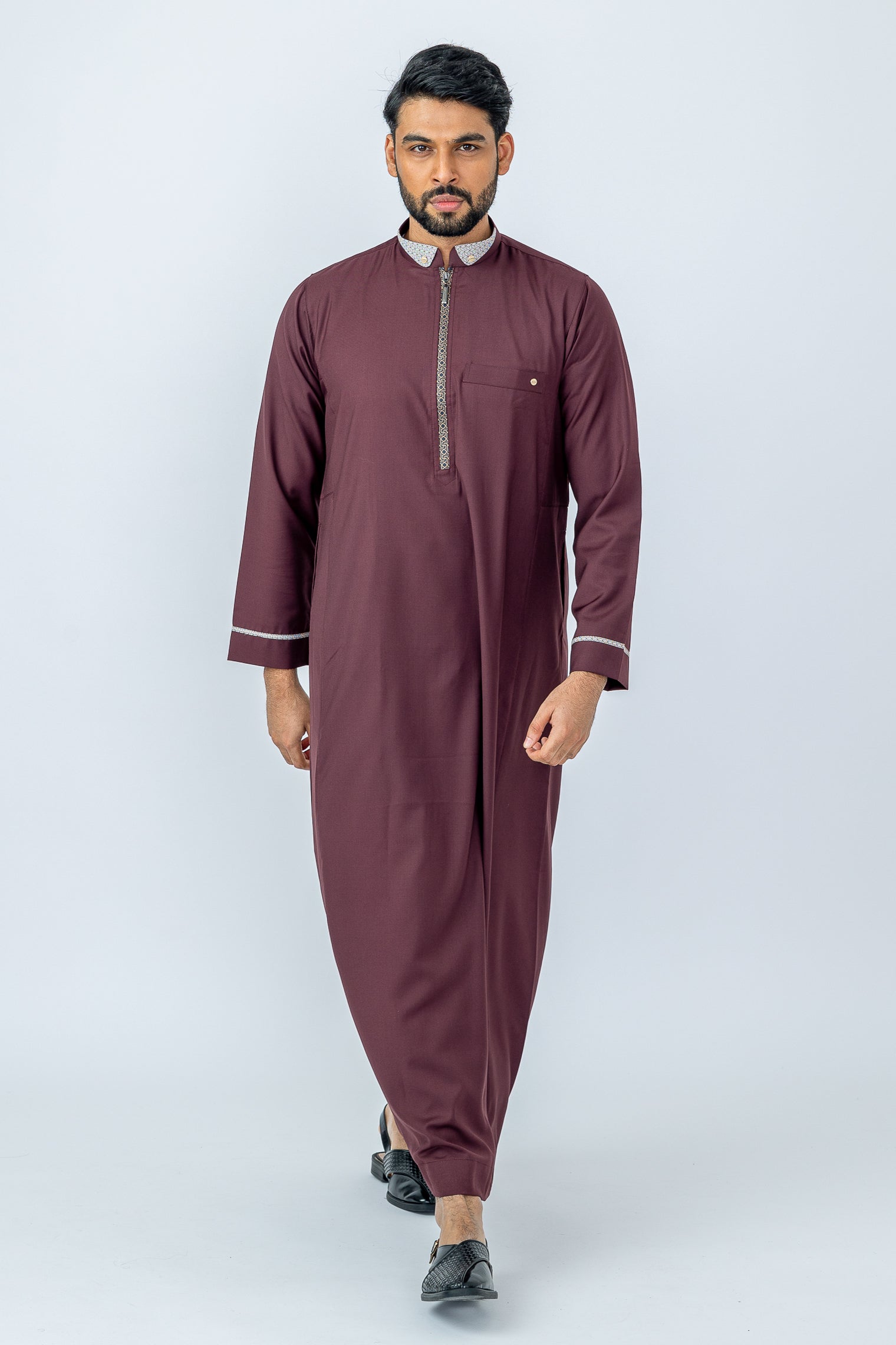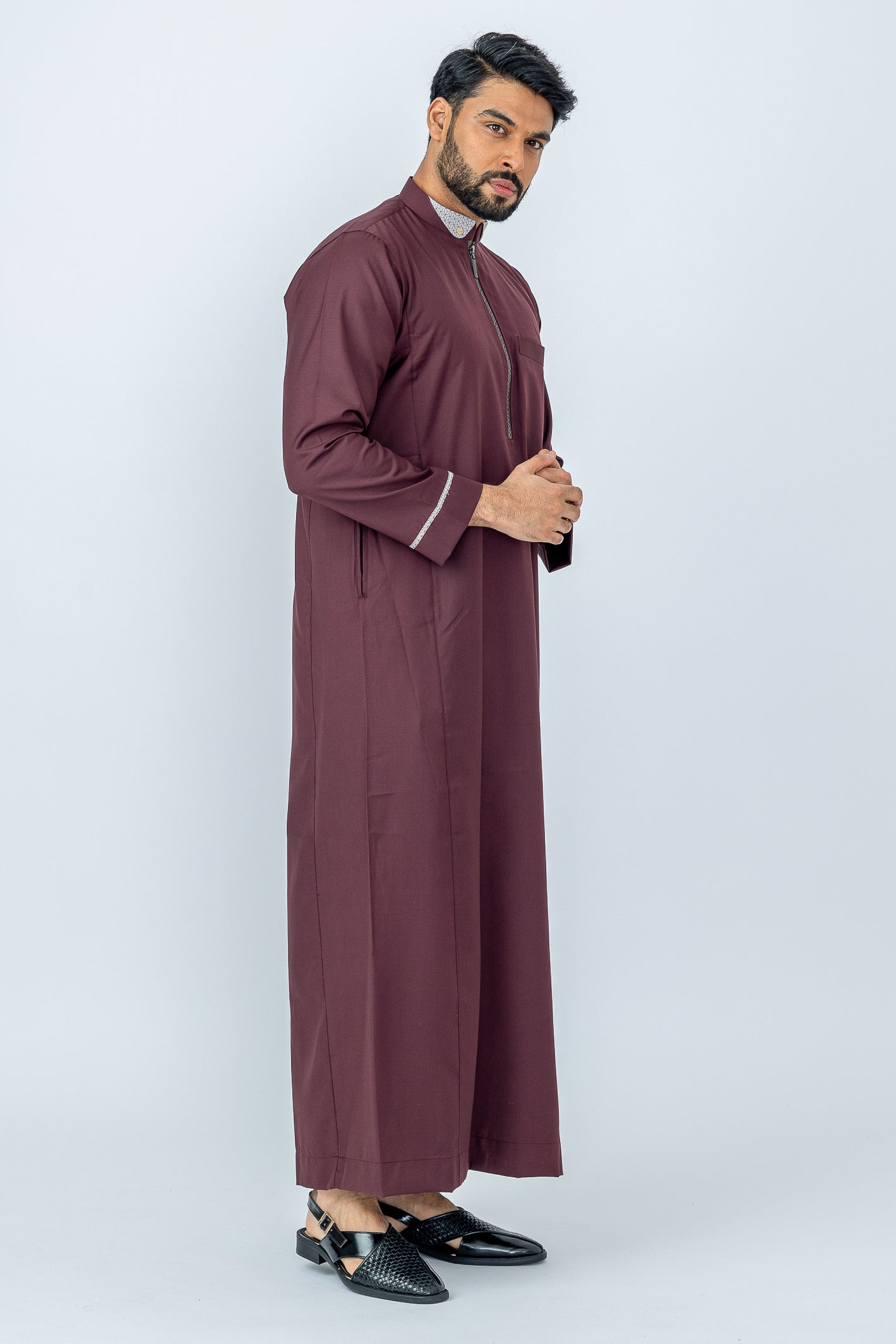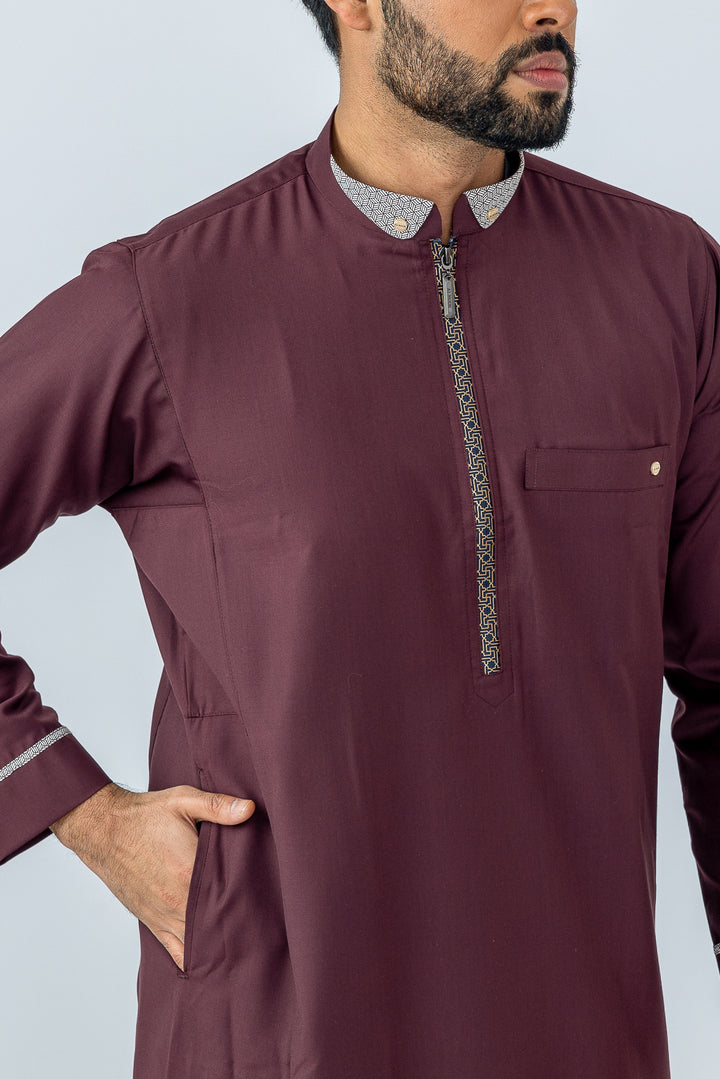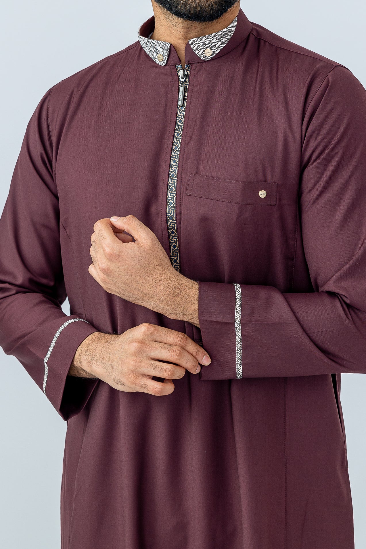 This Burgundy Cutaway Thobe features a modern design with a cutaway collar and overlay patterned fabric with rivets. A patterned zip opening and three pockets - one on the upper left chest and two side pockets - provide functional style. The garment is stitched on matt finished polyester fabric. Modern and stylish, this thobe is sure to make a statement.