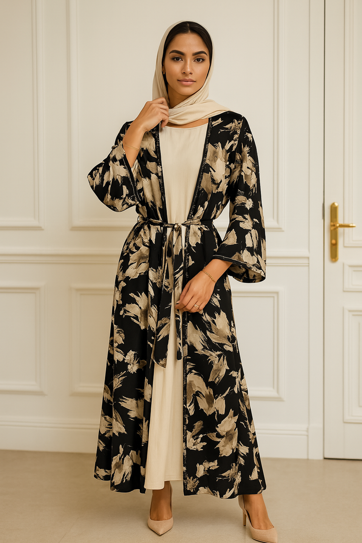 Step into elegance with the Noir Brushstroke Abaya, a perfect blend of sophistication and charm. Designed with intricate beadwork on the sleeves and a gracefully pleated hemline, this abaya brings timeless beauty to any occasion. The rich, earthy tone adds a touch of warmth, making it an ideal choice for both formal and casual wear. Draped in style, feel confident and radiant in this exquisite piece.