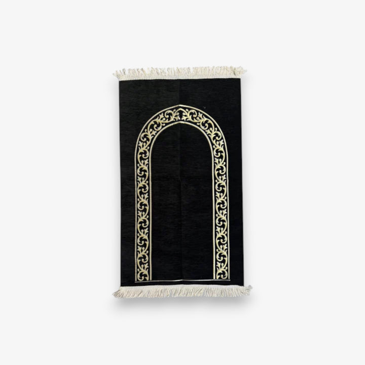 This black chenille prayer mat features a traditional design that helps indicate the direction of prayer. Its simple, elegant style makes it suitable for daily use and enhances focus during prayer. Durable and comfortable, it provides a clean and respectful space for your spiritual practice.