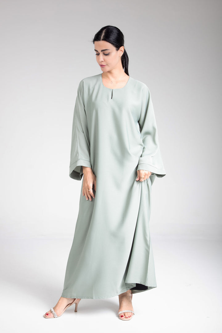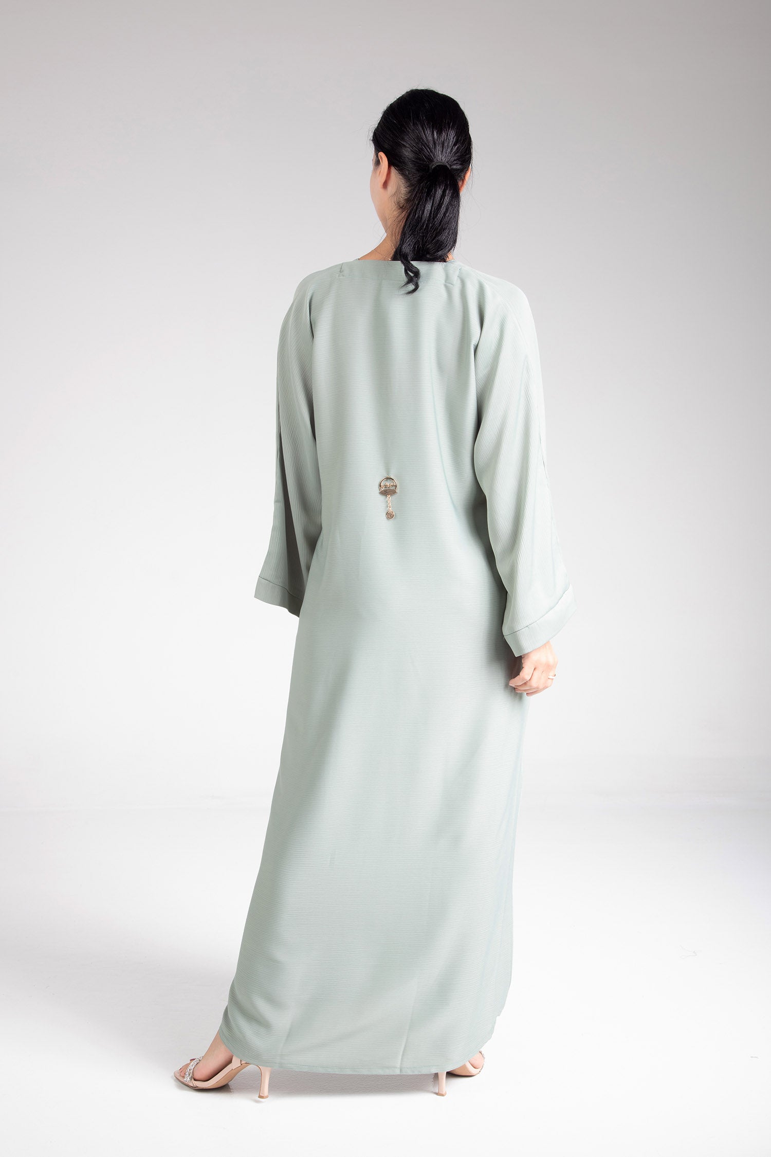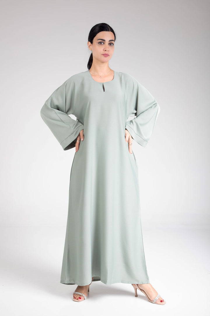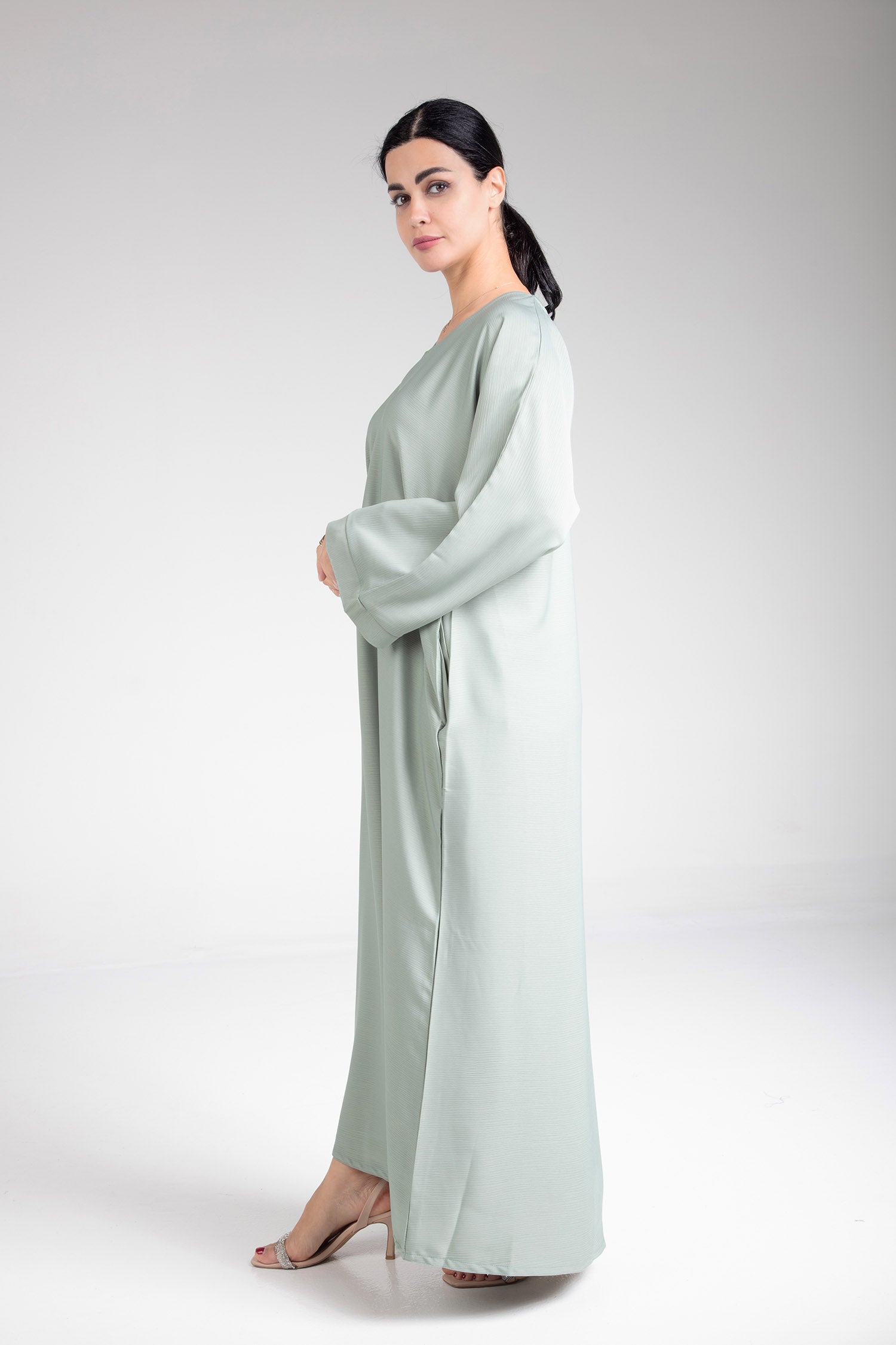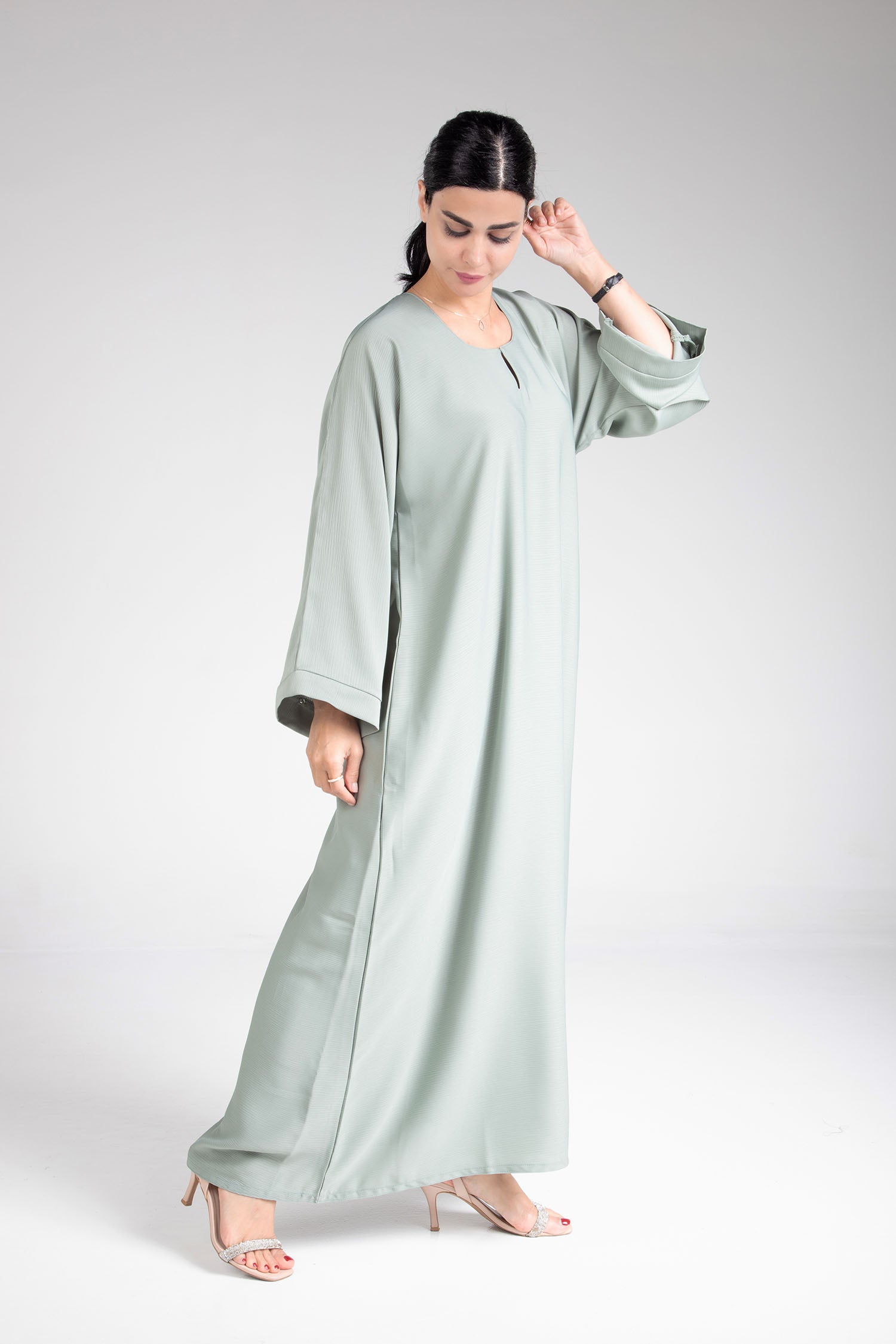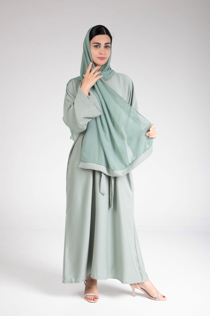 Elevate your modest wardrobe with our Classic GREENISH Abaya. Made with soft and lightweight ZOOM fabric. The closed design will keep you stylishly covered, and the hijab is included. Hand wash gently for best care.