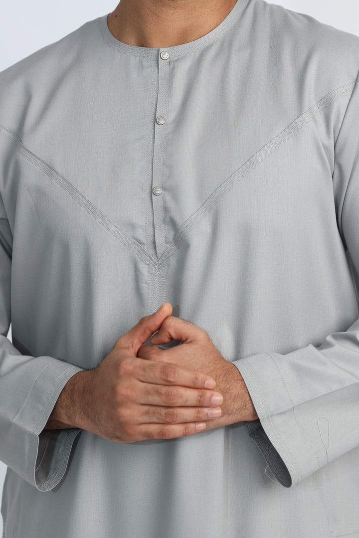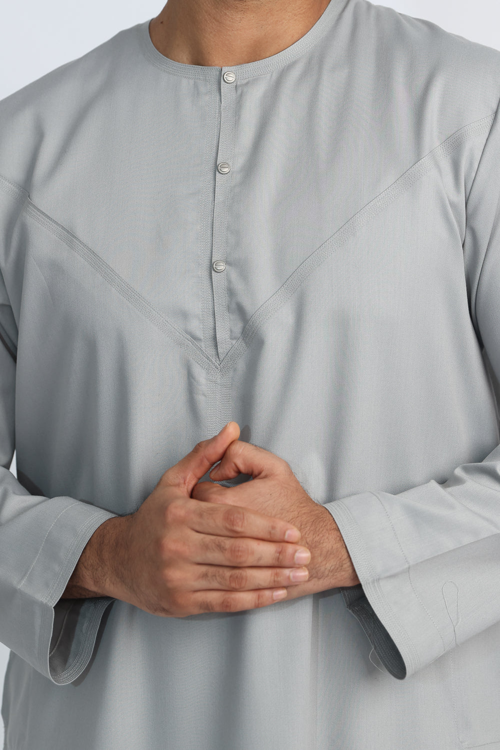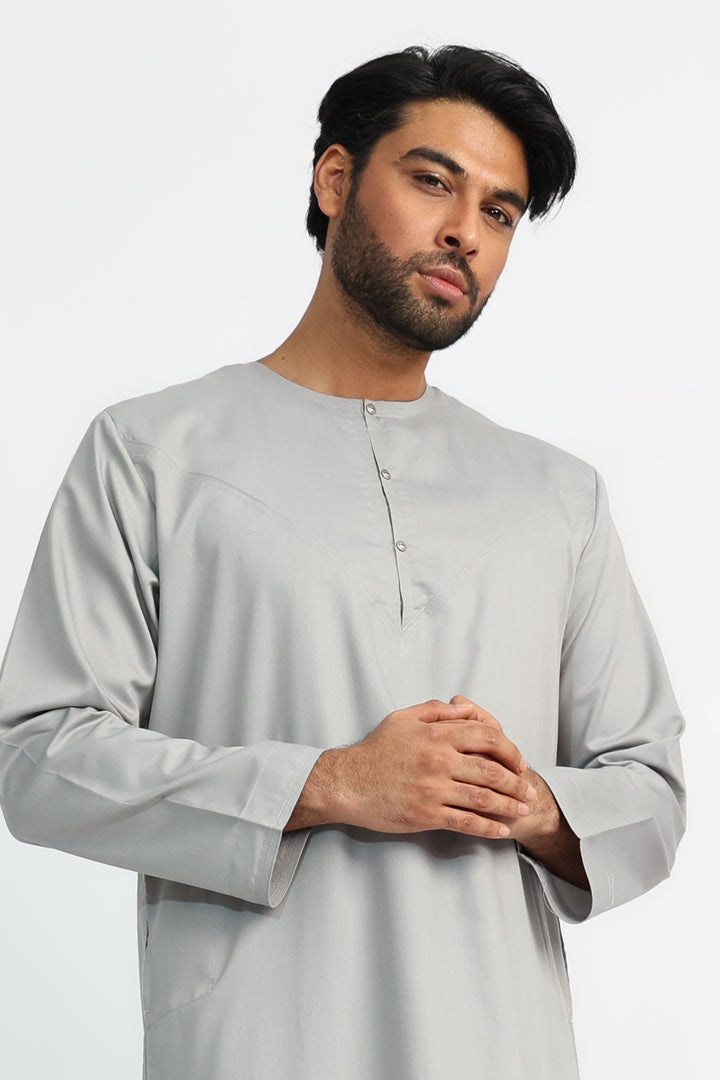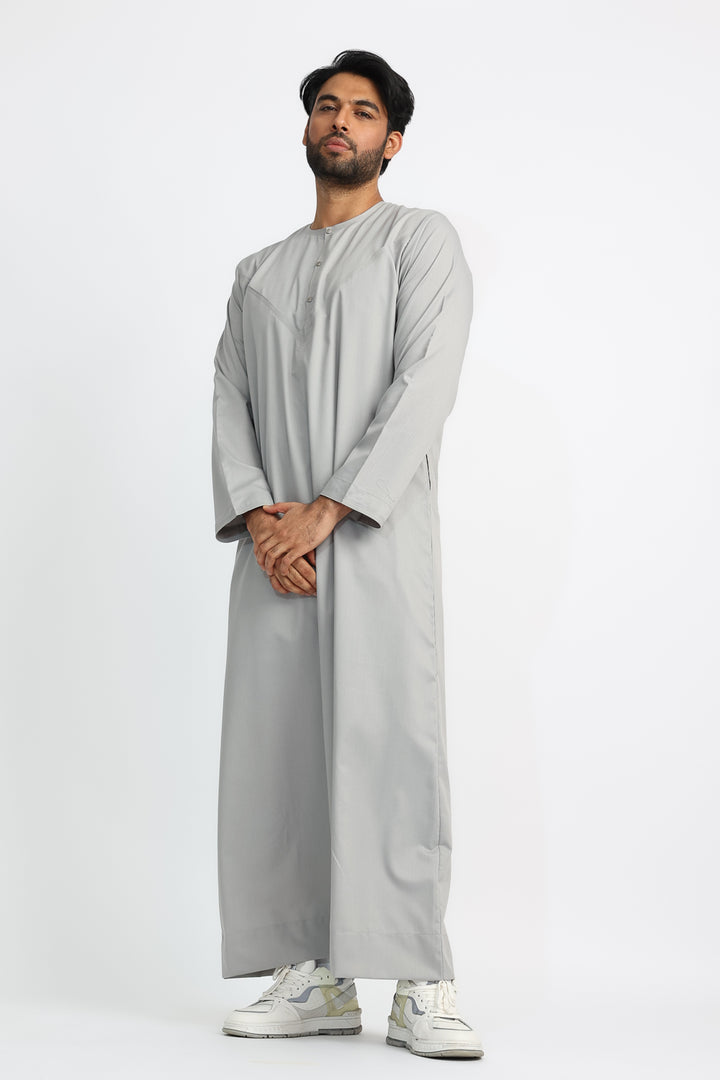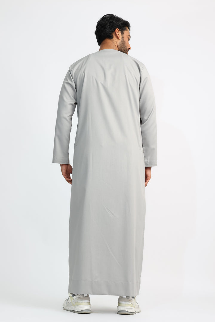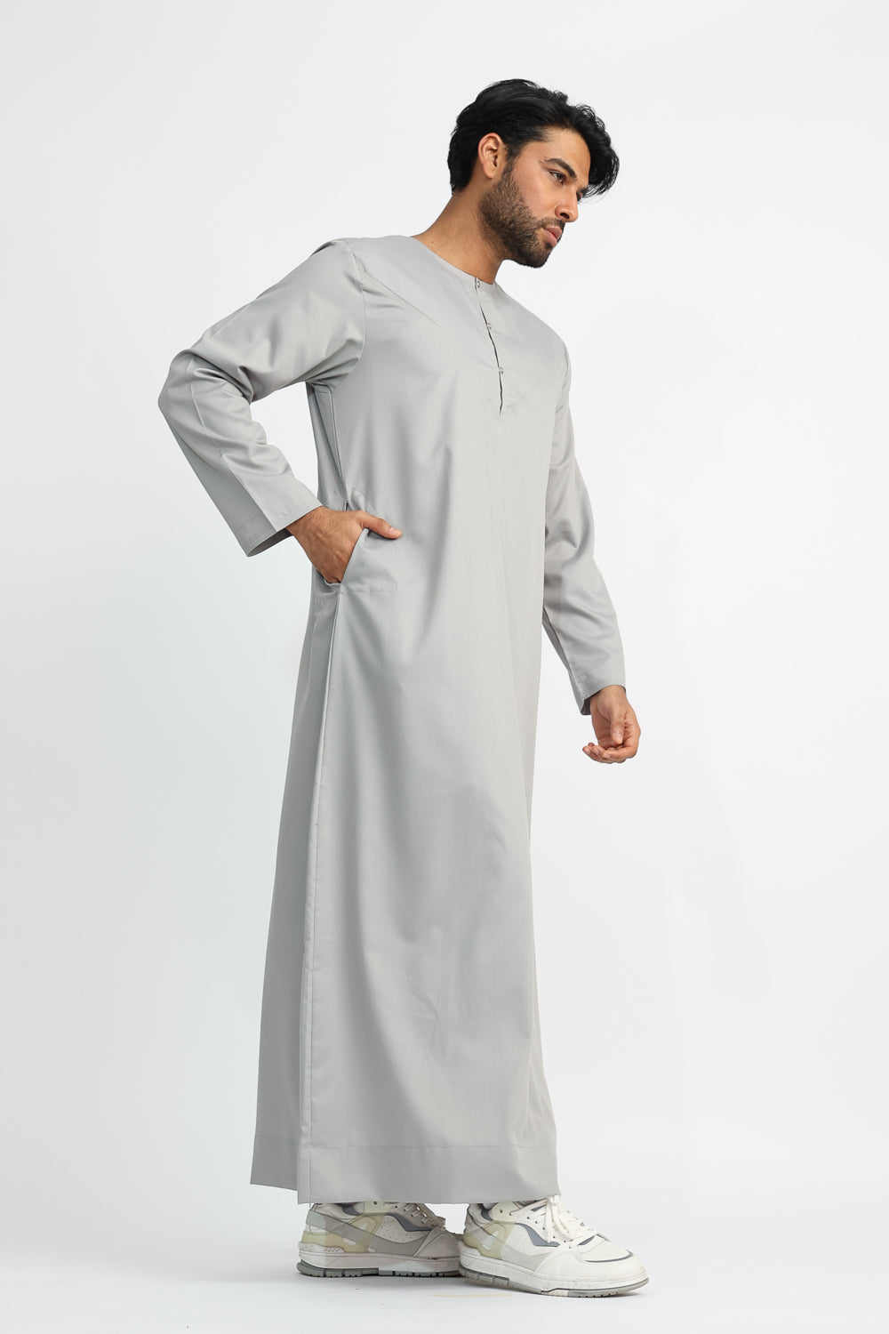 Experience the luxurious comfort and effortless style of our Mineral Green Omani. Crafted by Al Noor Thobe and soft matt fabric, this traditional thobe features a stylish press metal button opening, 2 side pockets for added convenience, and meticulous stitching. Elevate your wardrobe with this elegant piece.