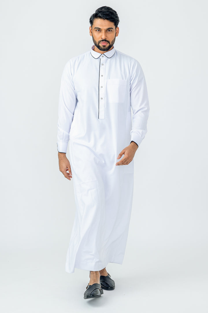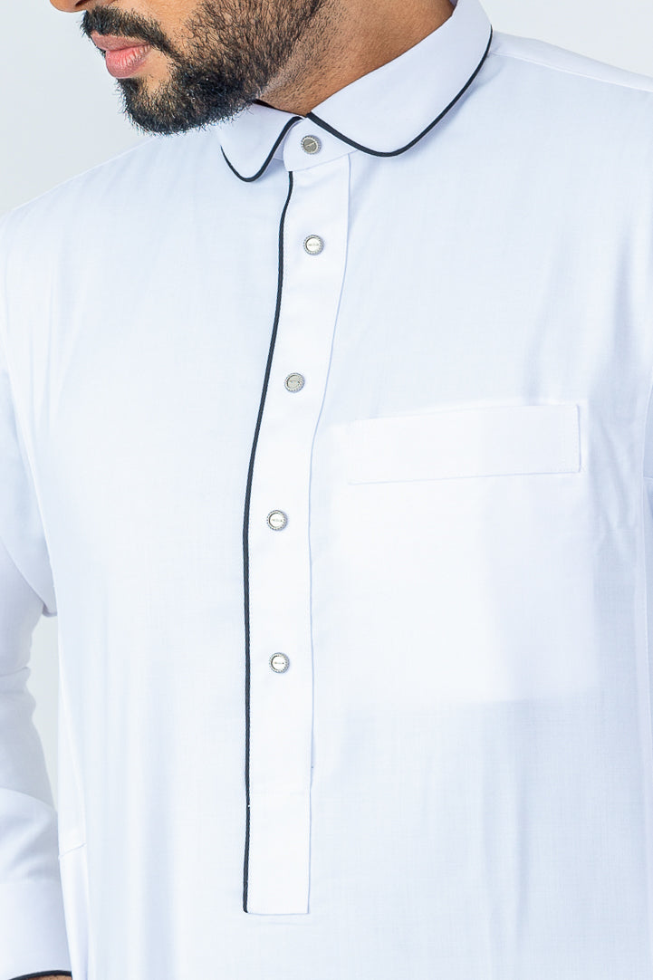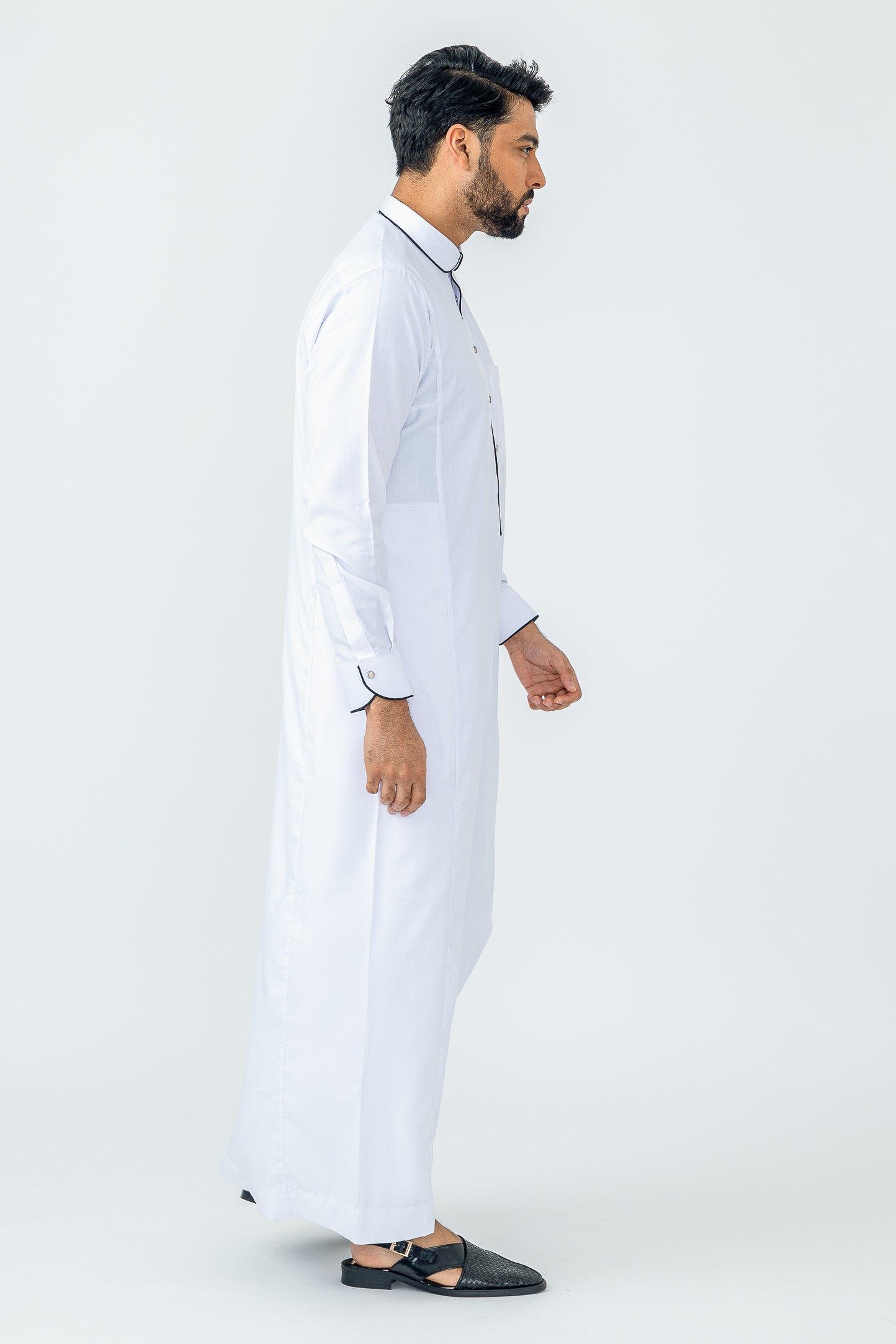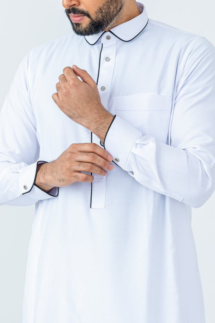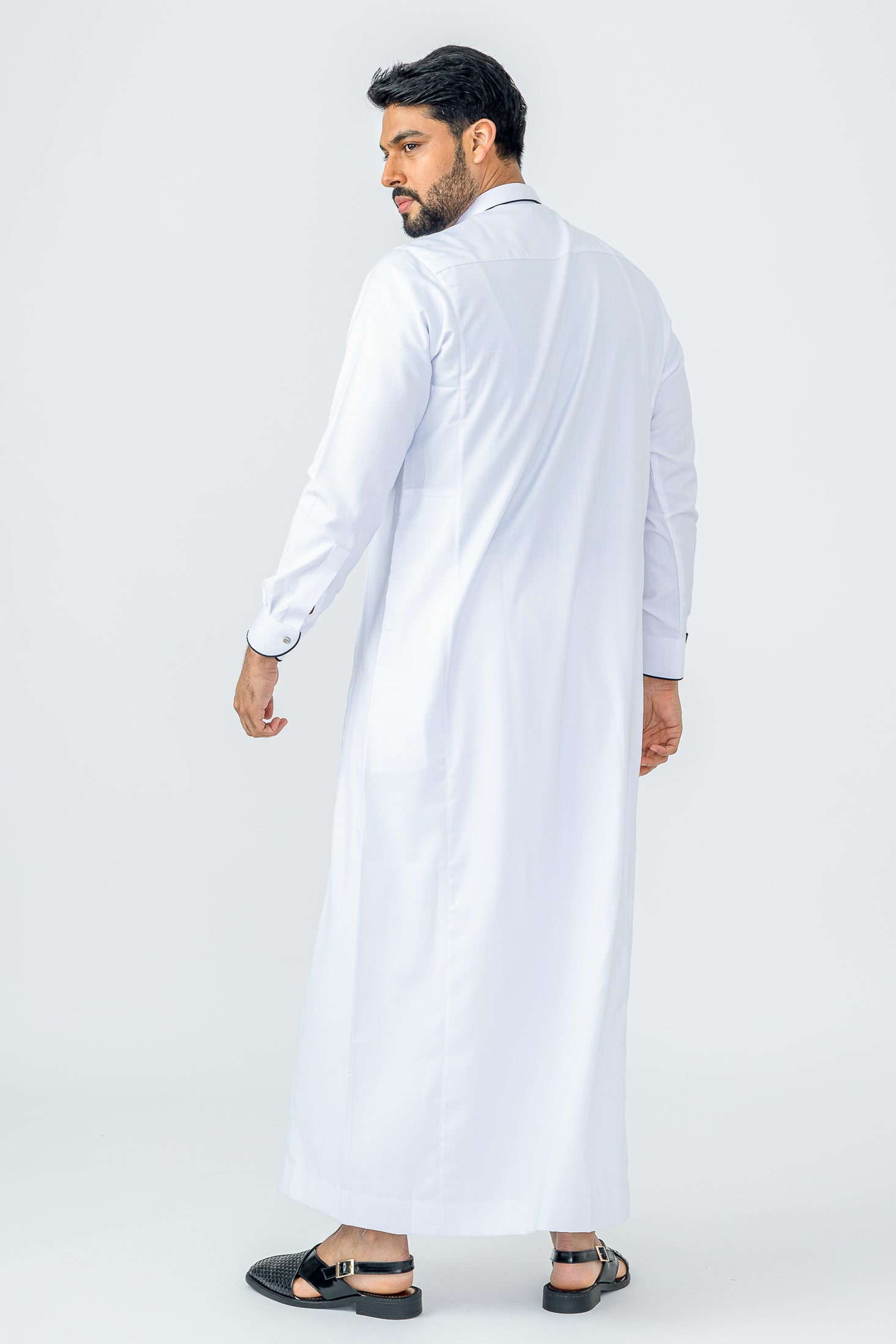 Ready for the Club Golf course? Our Al Noor Thobe Collection will have you winning style points with its smart White look, navy piping contrast detail on the collar and cuffs, and a button opening to make sure you look your best from tee to green! It's the perfect way to dress for the occasion every time. You'll feel stylish, confident, and ready for a great game!