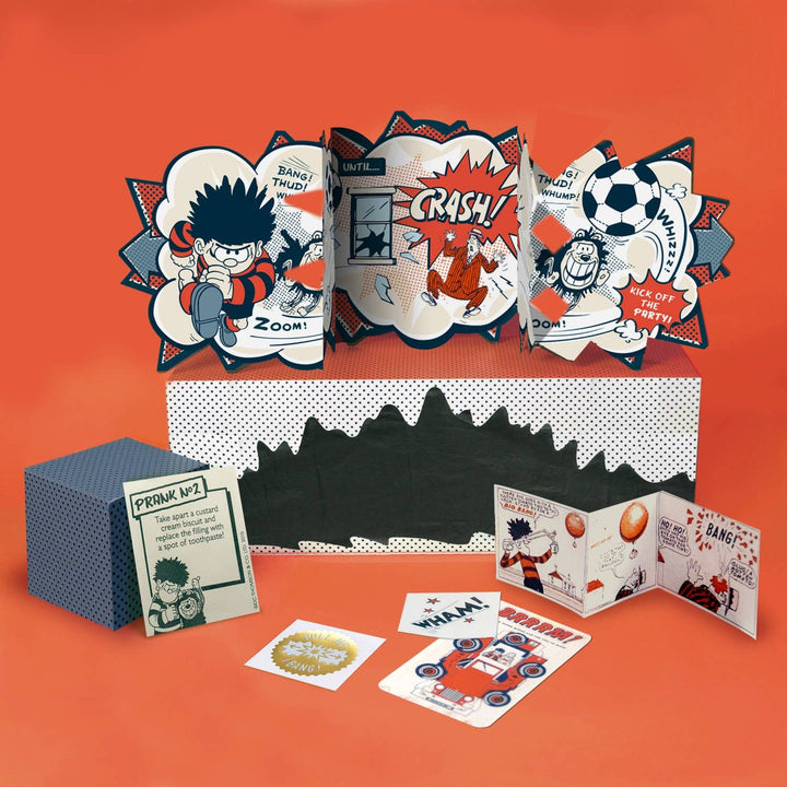 "Dennis the menace beano comic cracker card. A British classic since 1938, the beano characters are a fun and familiar sight to generations; from Dennis the menace and gnashes cheeky pranks, to the dauntless banana-man’s heroic deeds.
