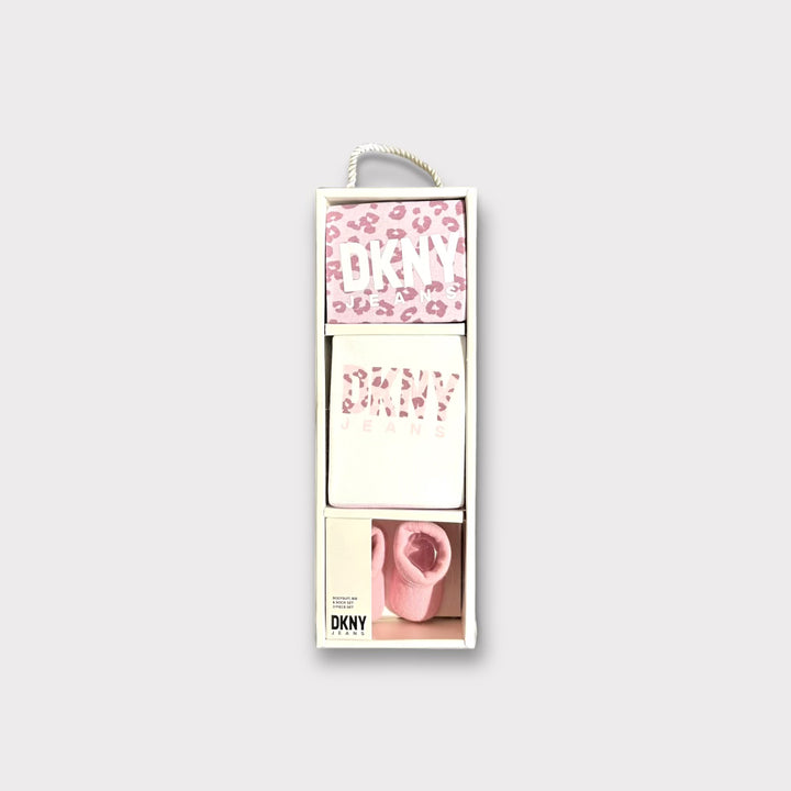 Introducing the DKNY 3 Piece Baby Set, perfect for any stylish baby. This set includes a comfortable body suit, convenient bib, and cozy socks, all available in 6 different color ways. Stay fashionable while keeping your little one comfortable and protected.