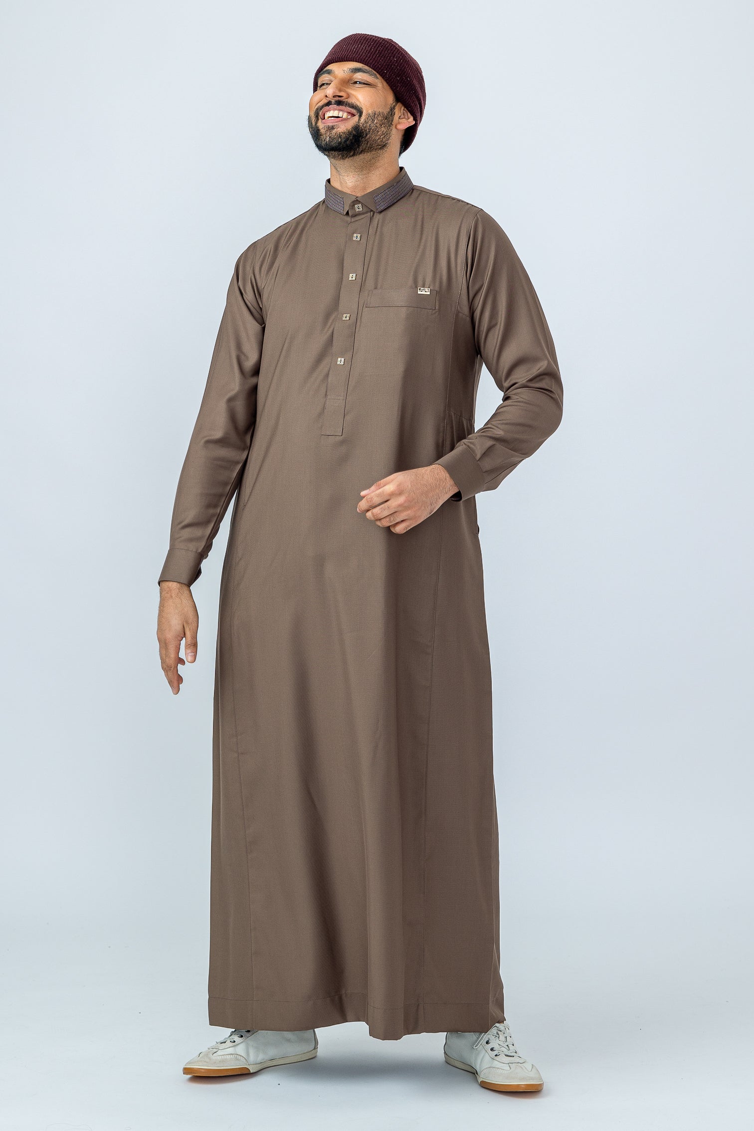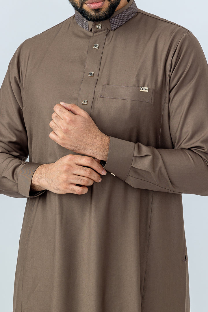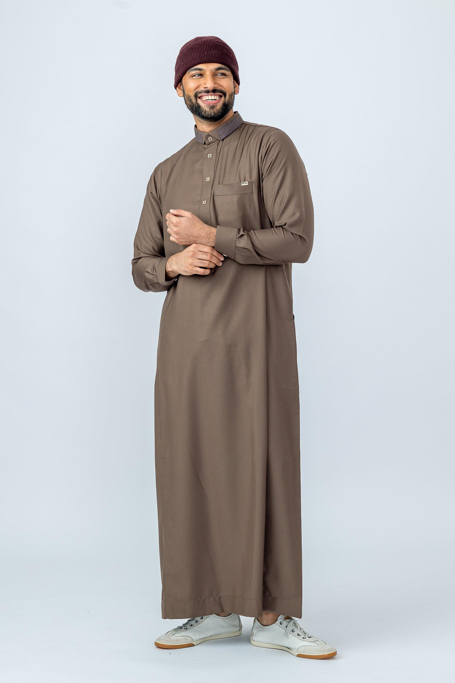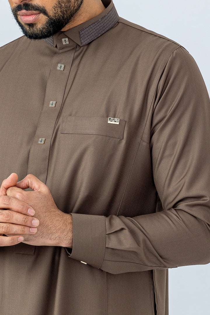 Stay stylishly sophisticated for special occasions with this Double Collar D505 Army Brown Thobe from Al Noor Eid|Wedding collection. Featuring a wing-style collar with textured fabric overlay, press button opening with elegant rivet on the front pocket, and a creative cuff style with metal press button and sewed texture fabric, this thobe is perfect for your formal look. Plus, it has two side pockets.