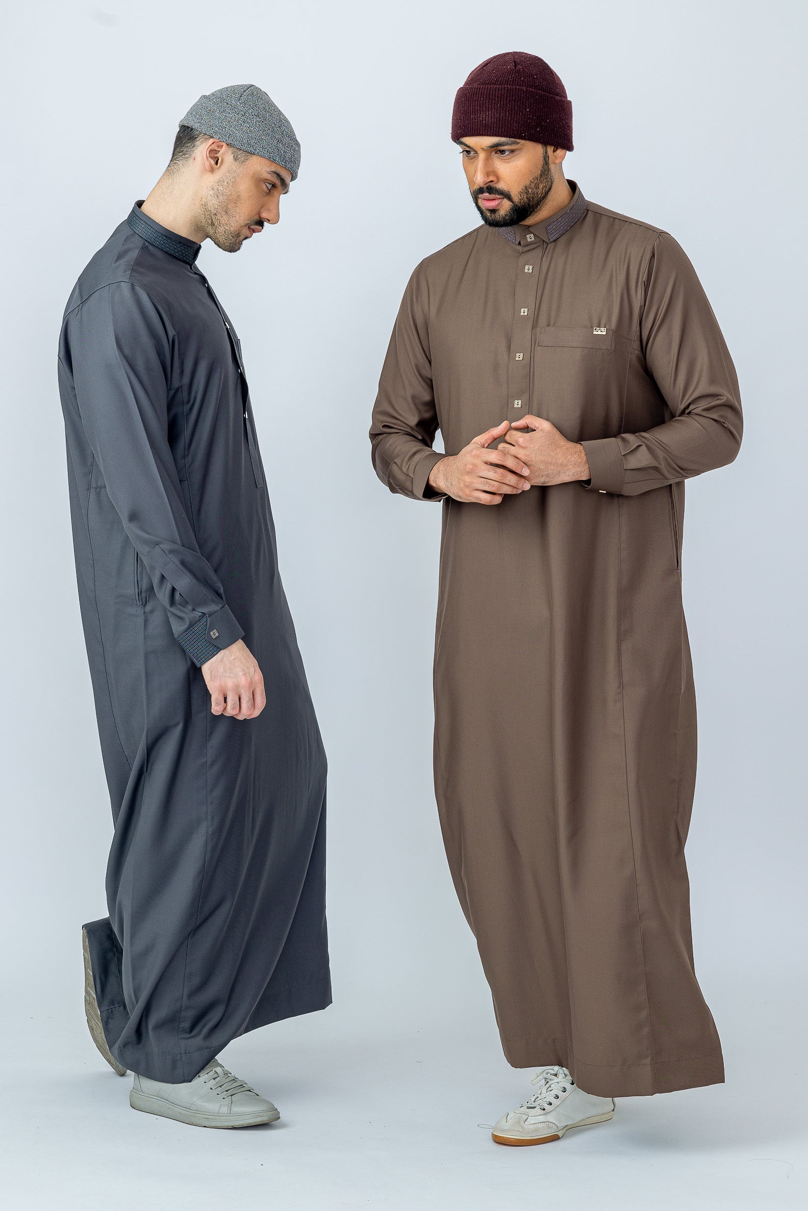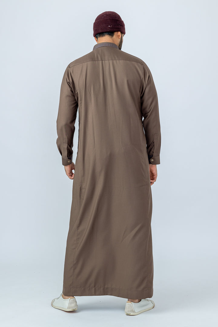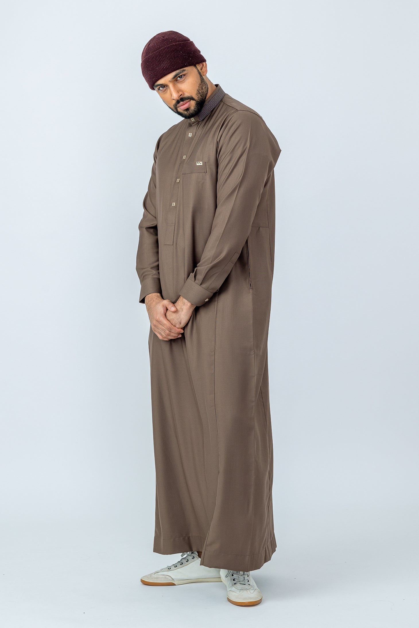 Stay stylishly sophisticated for special occasions with this Double Collar D505 Army Brown Thobe from Al Noor Eid|Wedding collection. Featuring a wing-style collar with textured fabric overlay, press button opening with elegant rivet on the front pocket, and a creative cuff style with metal press button and sewed texture fabric, this thobe is perfect for your formal look. Plus, it has two side pockets.