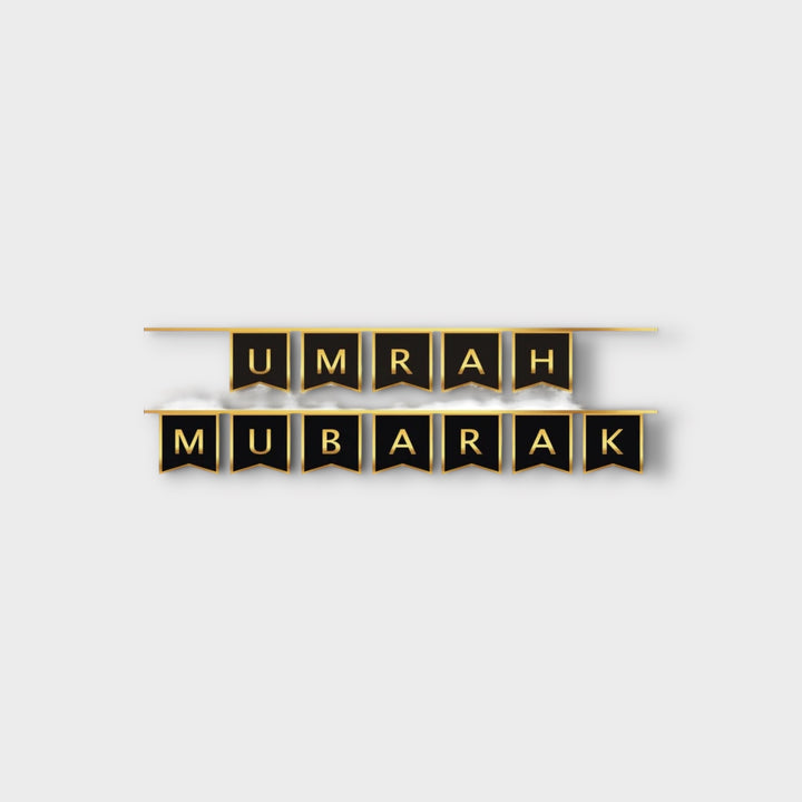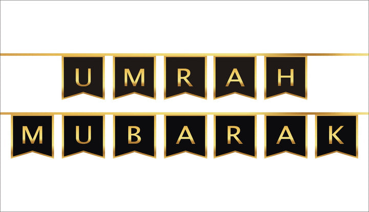 Welcome family and friends returning back from Umrah by decorating your home with Islamic Moments reusable, Umrah Mubarak letters bunting pack in black with gold foil.