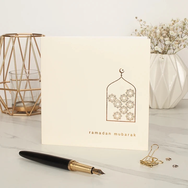 An exquisite Ramadan Mubarak card from Islamic Moments luxurious "Rose & Co" collection. Welcome and celebrate the blessed month of Ramadan with this elegant card in cream with gold foiled lettering on linen embossed board.