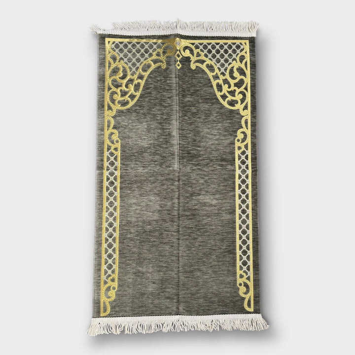In a sophisticated charcoal grey, this prayer mat offers a contemporary take on traditional design. The plush surface is complemented by striking gold metallic borders featuring precise geometric patterns. The ornamental mihrab arch and corner scrollwork create an elegant contrast against the grey background. White fringed edges provide a clean, polished finish to this modern-classic piece.