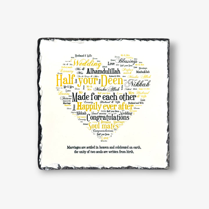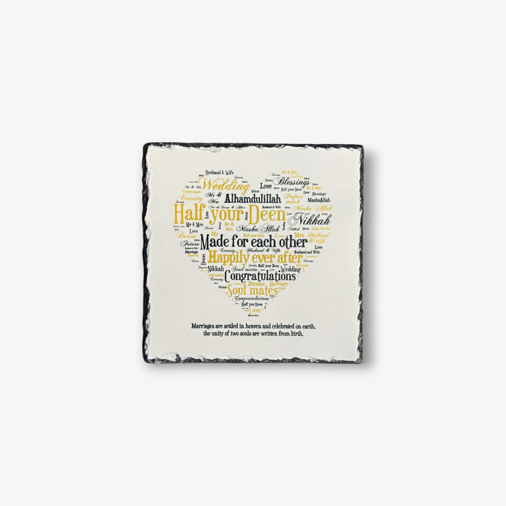 The Half Your Deen Slate is a beautiful, heart-shaped piece of slate that is perfect for displaying the most important elements of your faith. It's the perfect way to honor and remind yourself of your faith in a stylish and sophisticated manner.