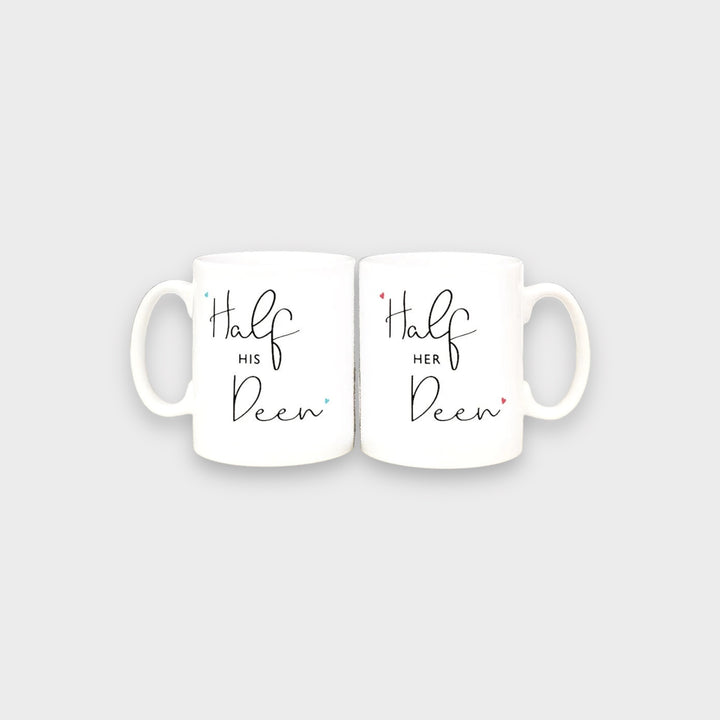 - 2 x 10 oz white ceramic mugs - Half His Deen & Half Her Deen Stylized font