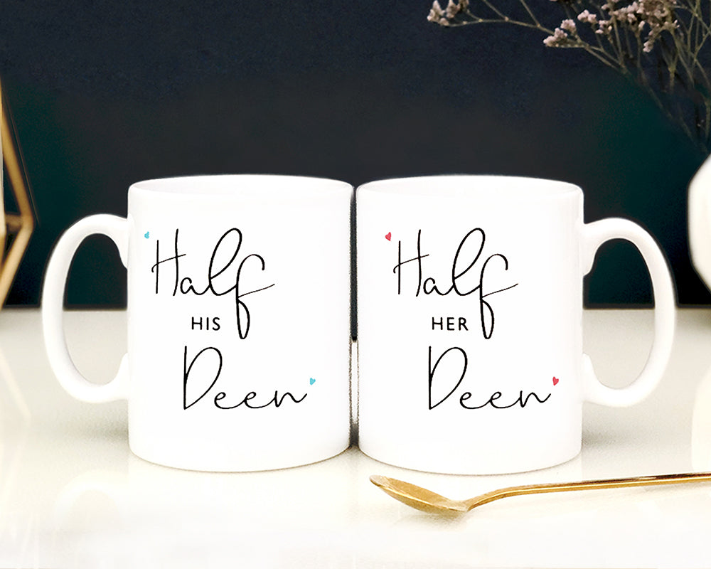 Half His Deen & Half Her Deen Stylized. The contemporary designed mugs, with their cute messages, would be a great wedding or anniversary gift.