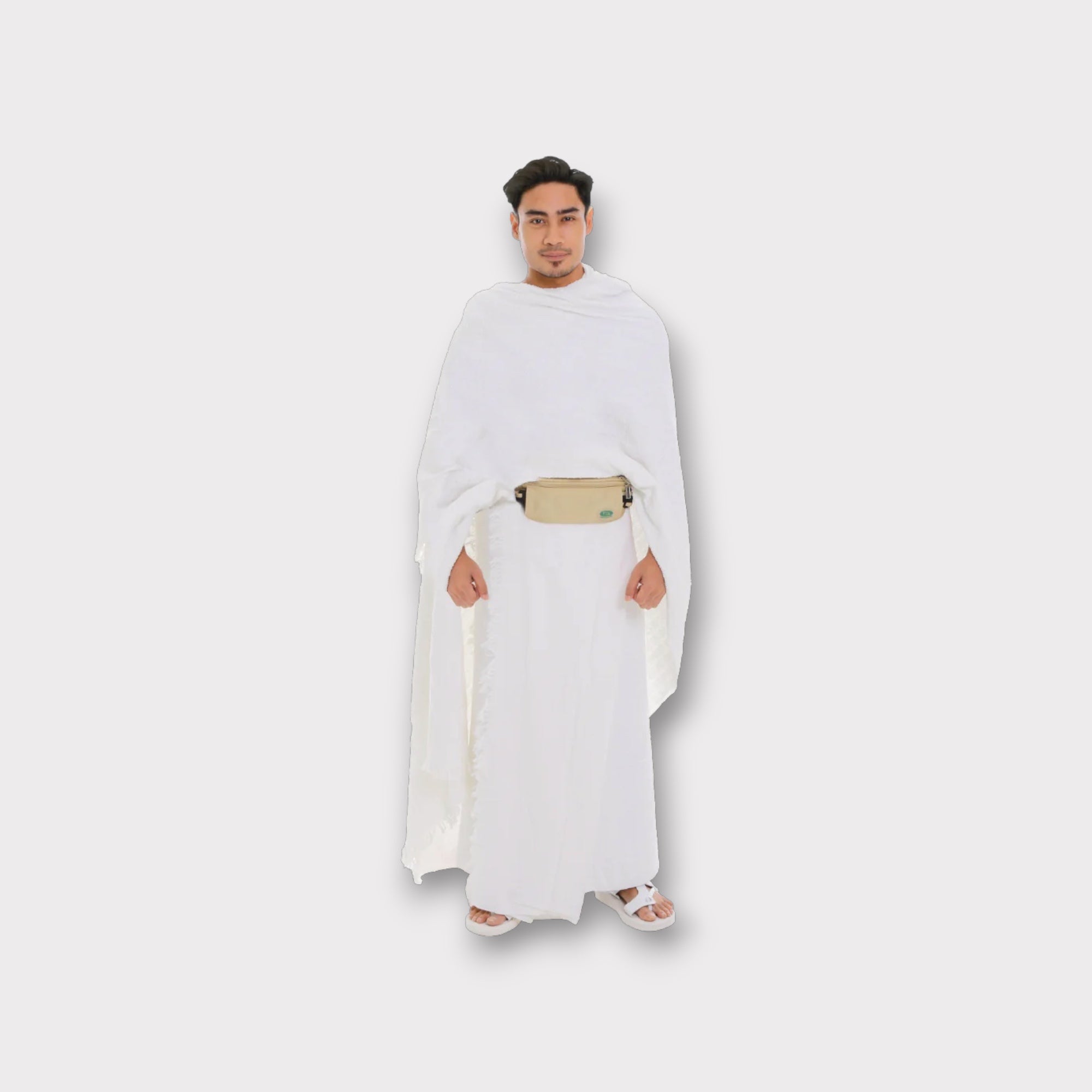 Ihram (إحرام iḥrām, from the triconsonantal root Ḥ-R-M) is, in Islam, a sacred state which a Muslim must enter in order to perform the major pilgrimage (Hajj) or the minor pilgrimage (Umrah). Clothing (for men) consists of 2 large size towels usually made from high quality, thick and soft, towel material.