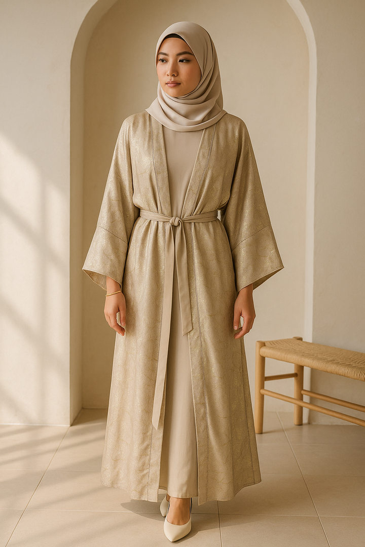 Step into elegance with the Ivory Abaya, a perfect blend of sophistication and charm. Designed with intricate beadwork on the sleeves and a gracefully pleated hemline, this abaya brings timeless beauty to any occasion. The rich, earthy tone adds a touch of warmth, making it an ideal choice for both formal and casual wear. Draped in style, feel confident and radiant in this exquisite piece.