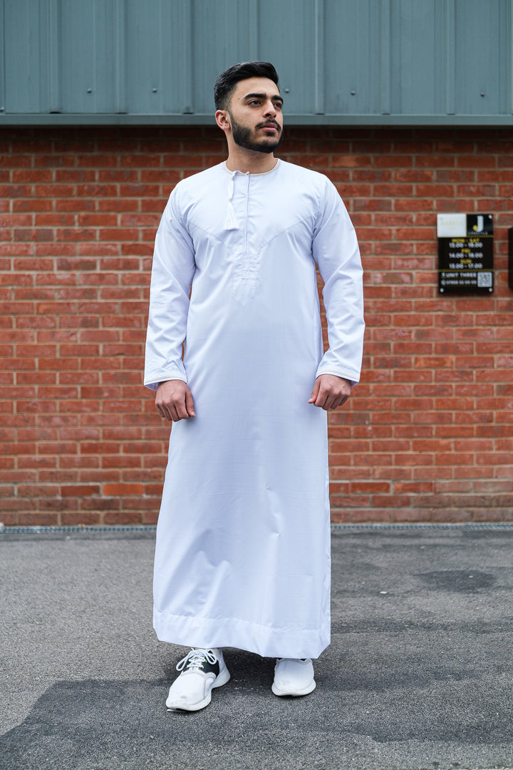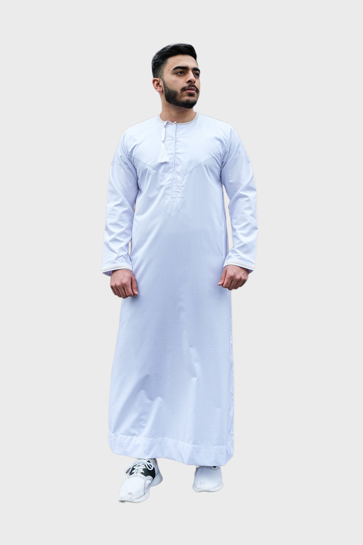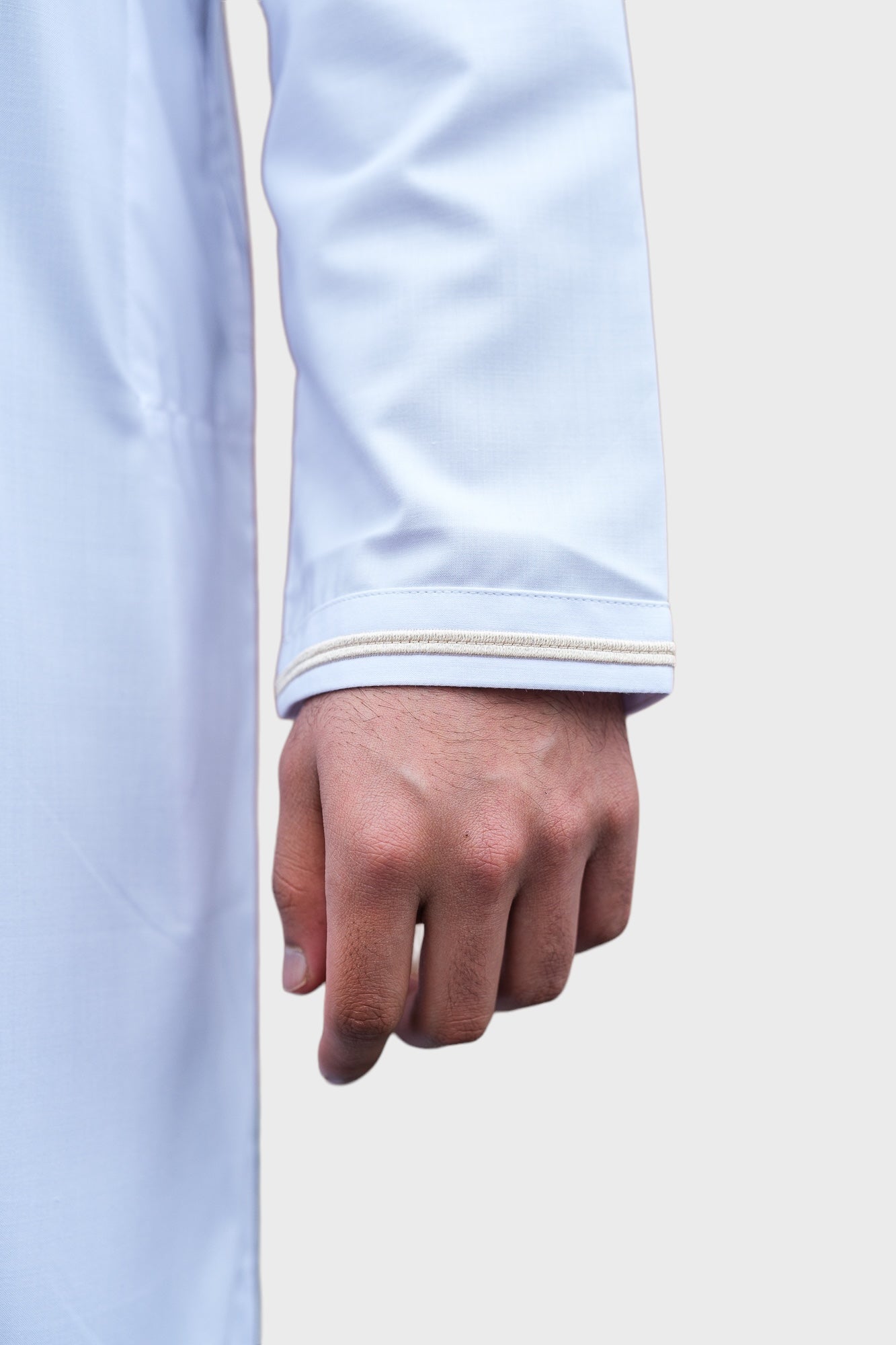 - White Fabric: The thobe is made from high-quality Soft Polyester fabric, a colour that is both modern and striking.