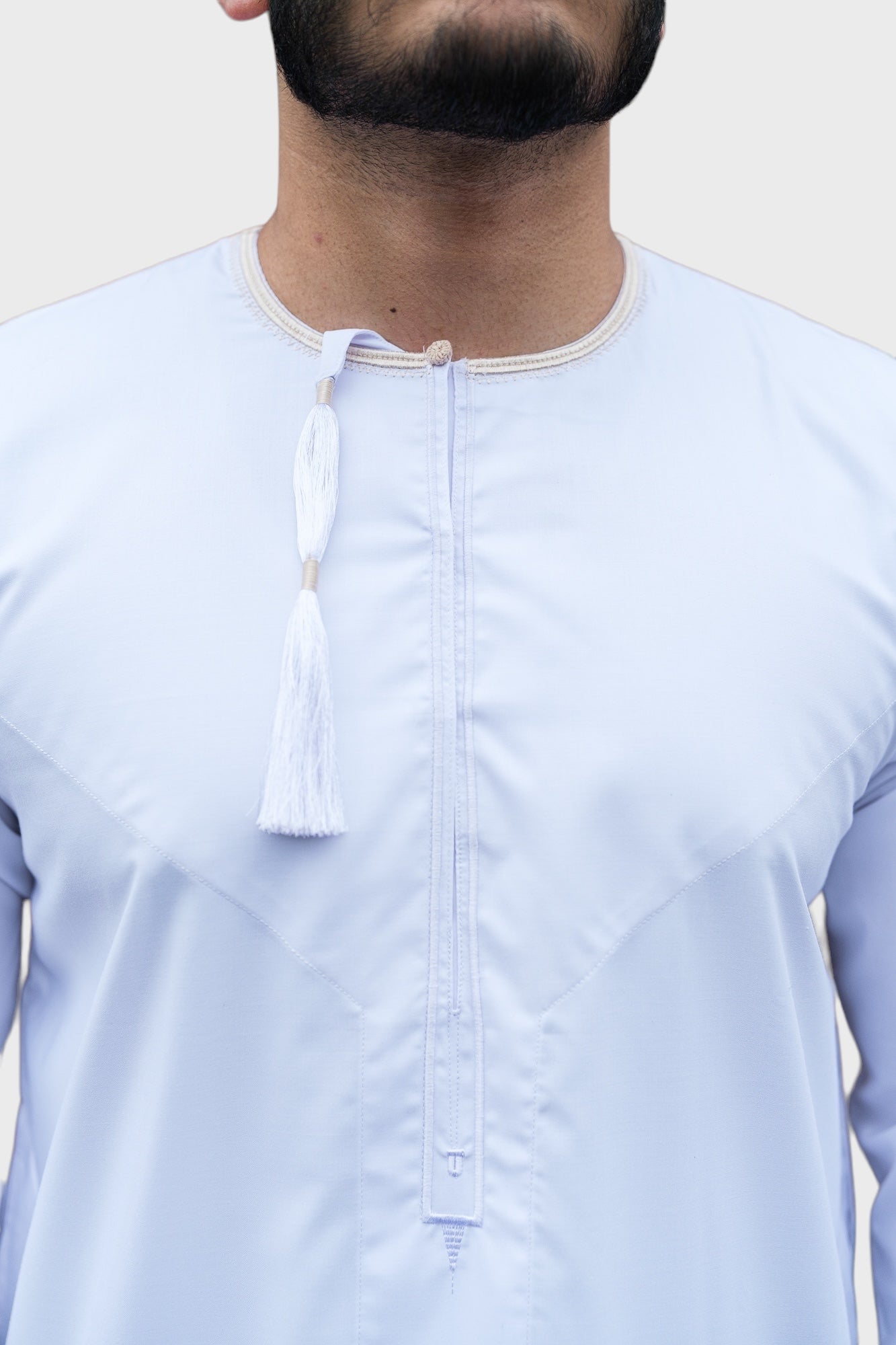 - Habeel (String): It features a small Qatari habeel, which is a non-removable string that adds an authentic traditional detail to the garment.
