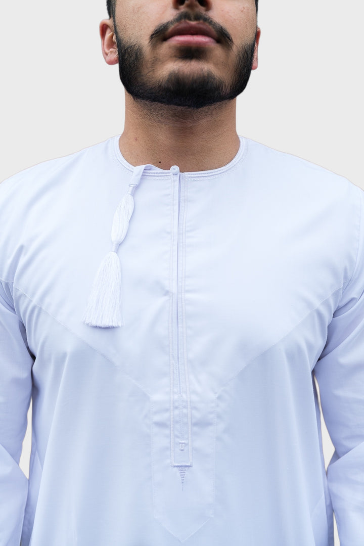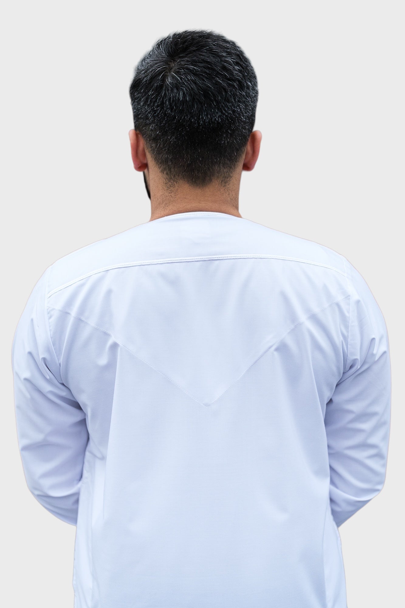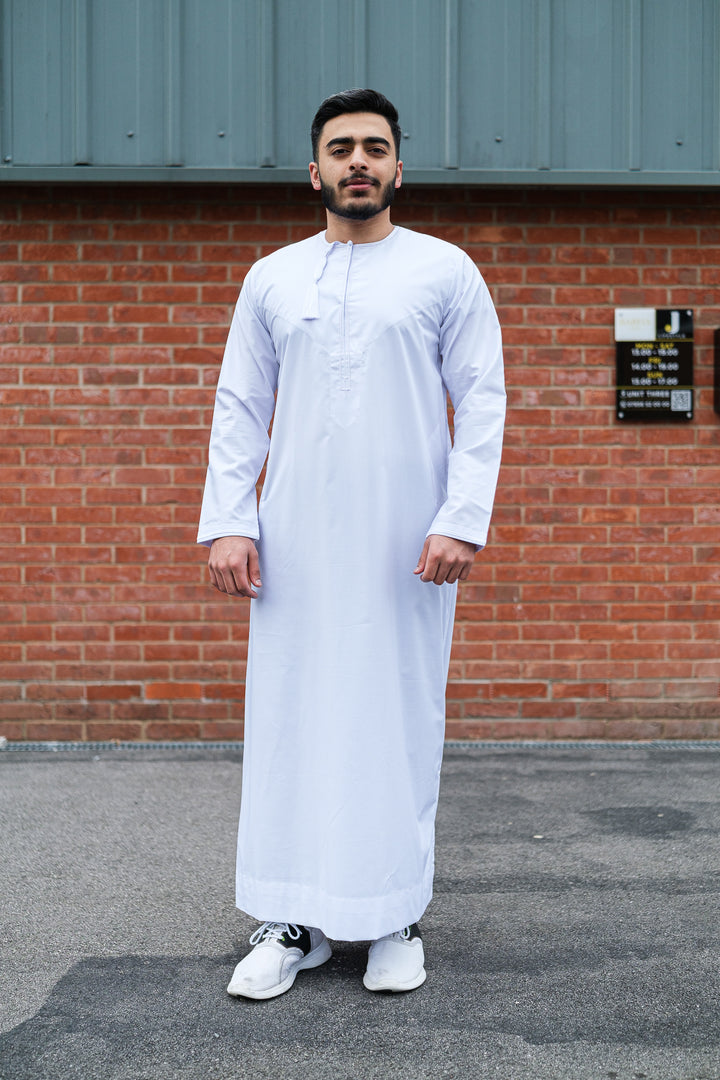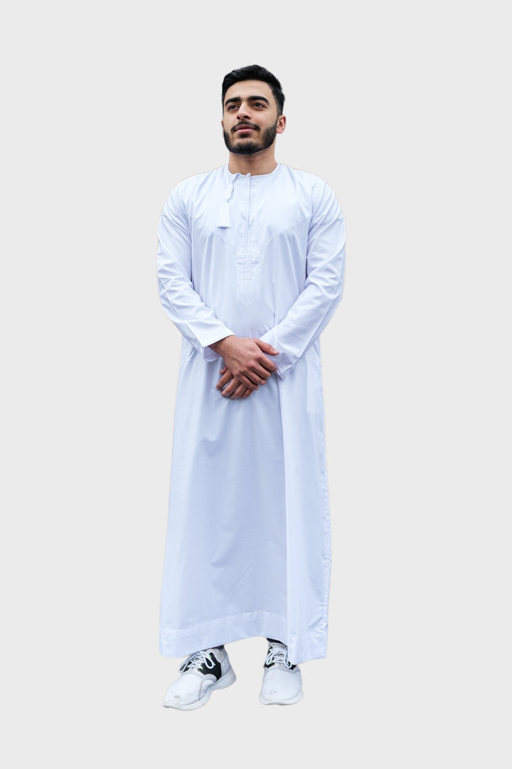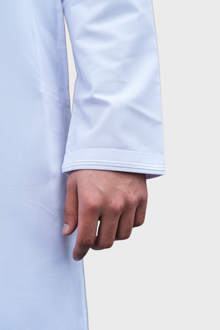 - White Fabric: The thobe is made from high-quality Soft Polyester fabric, a colour that is both modern and striking.