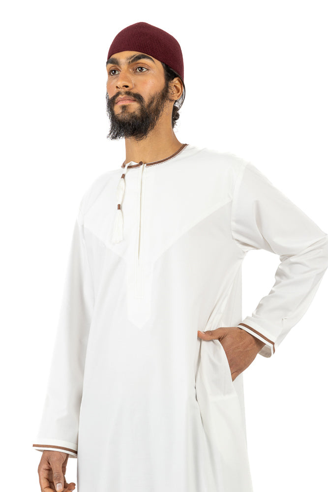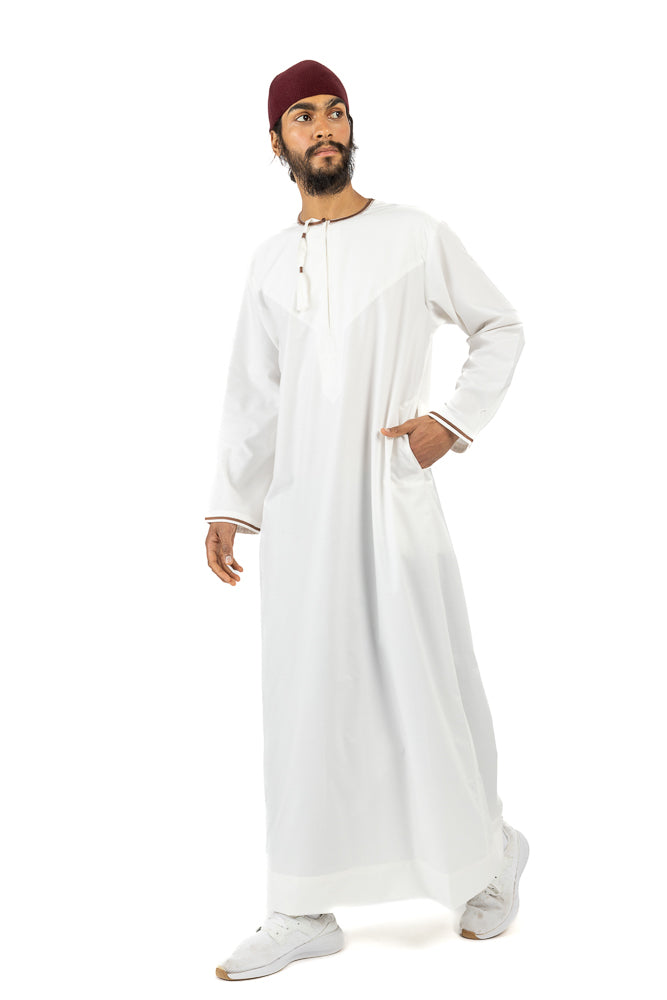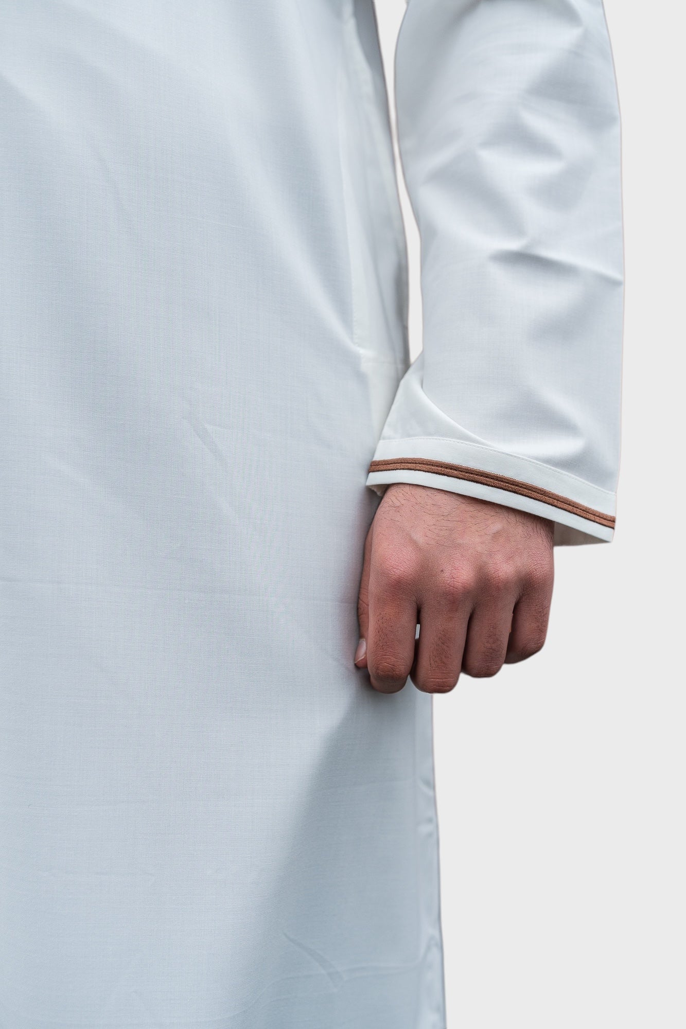 - Habeel (String): It features a small Qatari habeel, which is a non-removable string that adds an authentic traditional detail to the garment.
