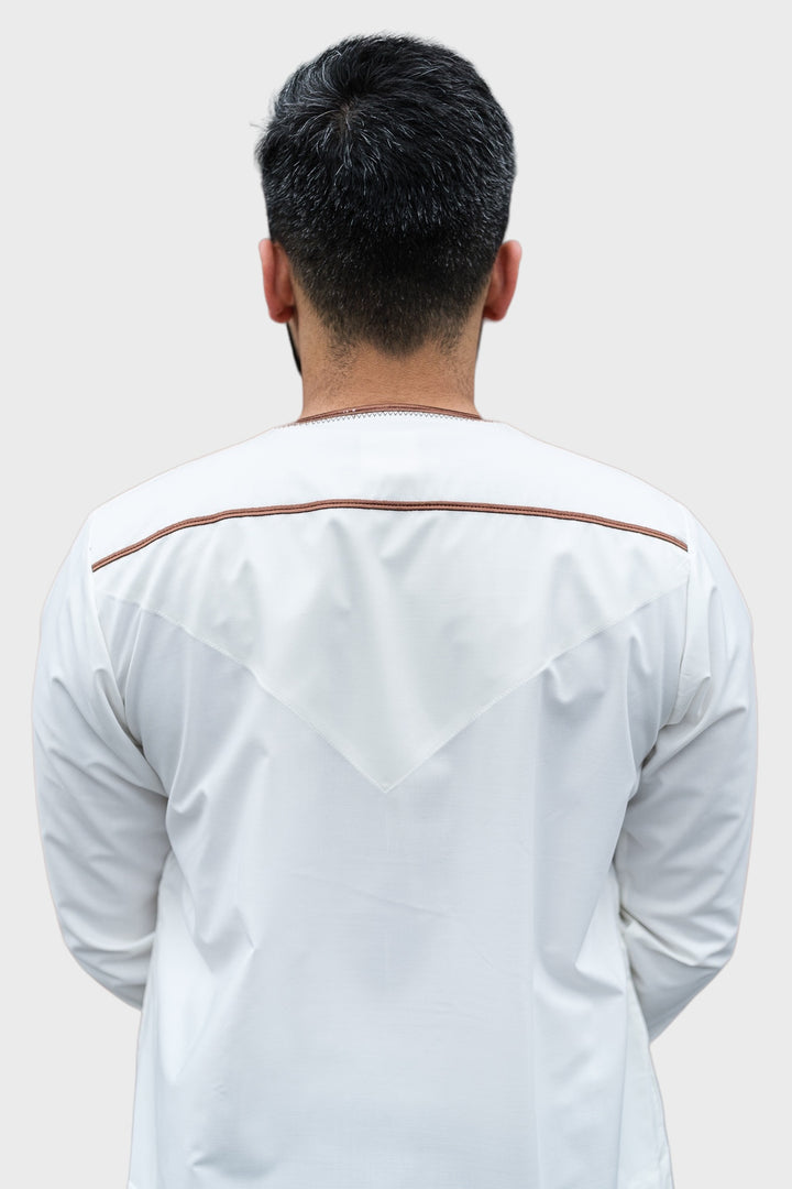 The newest collection by Al Noor, featuring the Qatari style round neck Habeel thobe, is a masterpiece of modern and traditional fashion. The detailed brown embroidery on the cream fabric creates a stunning visual impact, making this thobe a perfect choice for both special occasions and daily wear. Its combination of sophisticated design, intricate craftsmanship, and practical features ensures that you will stand out with elegance and style