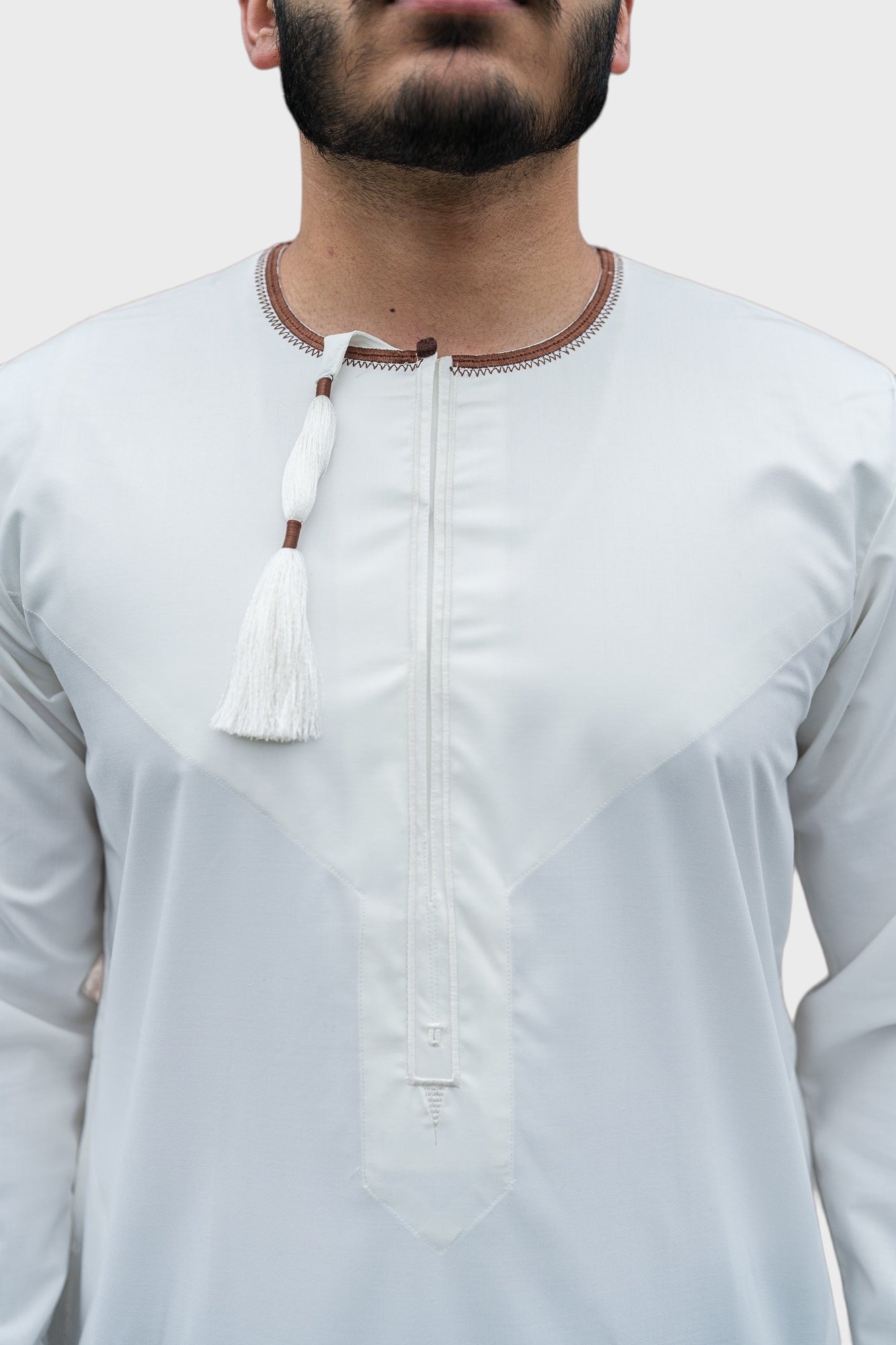 - Brown Embroidery: The Brown detailed embroidery provides a beautiful contrast to the Cream fabric, making the intricate patterns stand out and giving the thobe a vibrant and eye-catching look.
