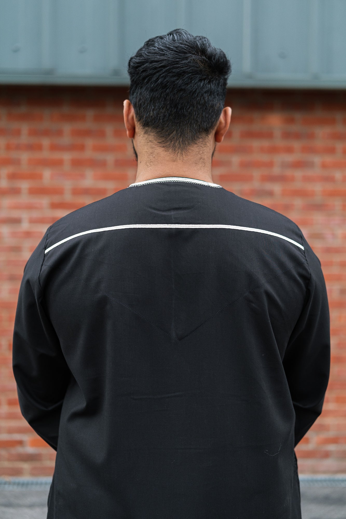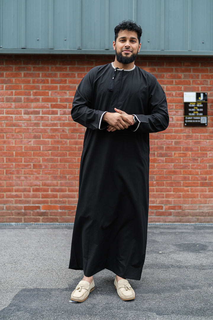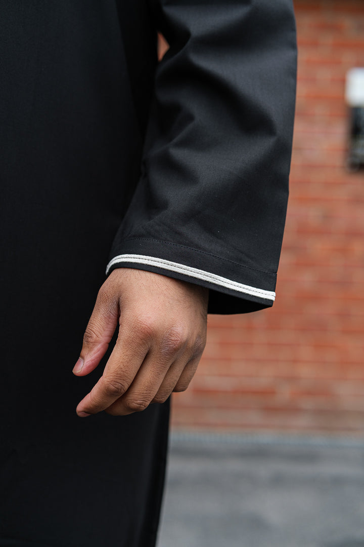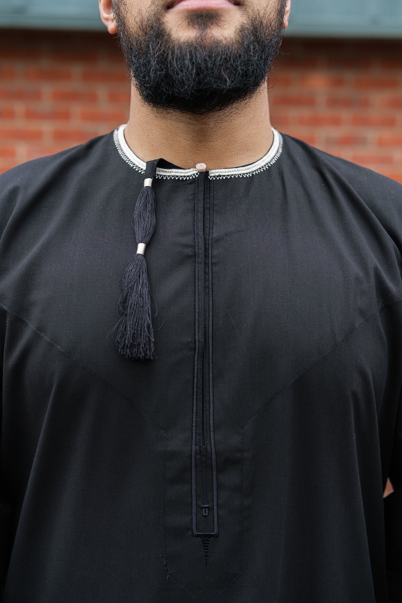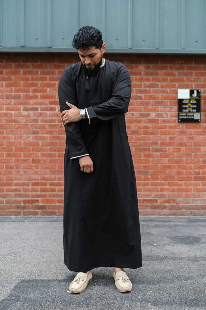 - Black Fabric: The thobe is made from high-quality Soft Polyester fabric, a colour that is both modern and striking.