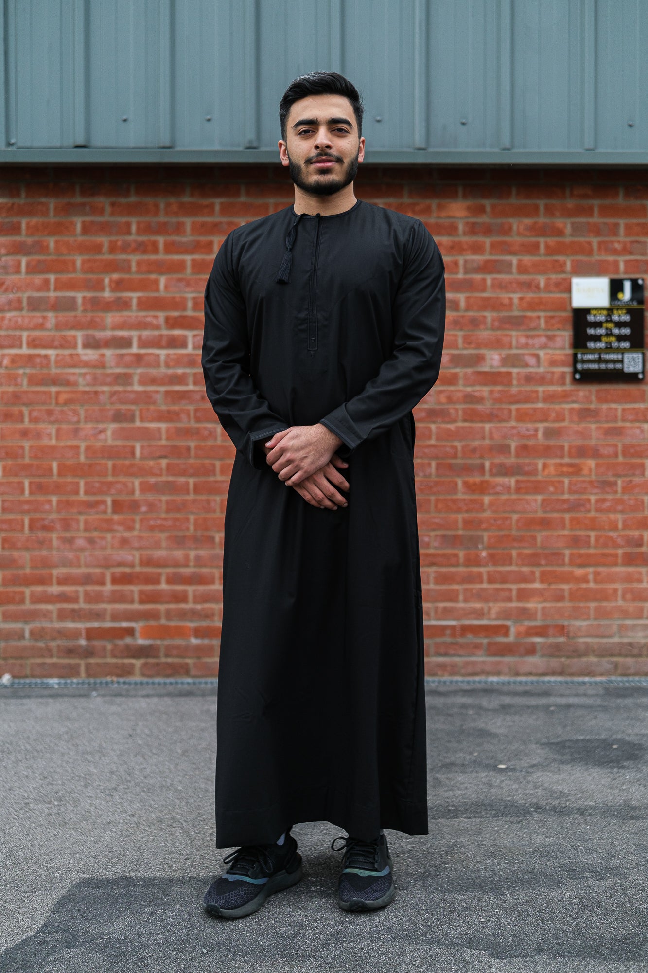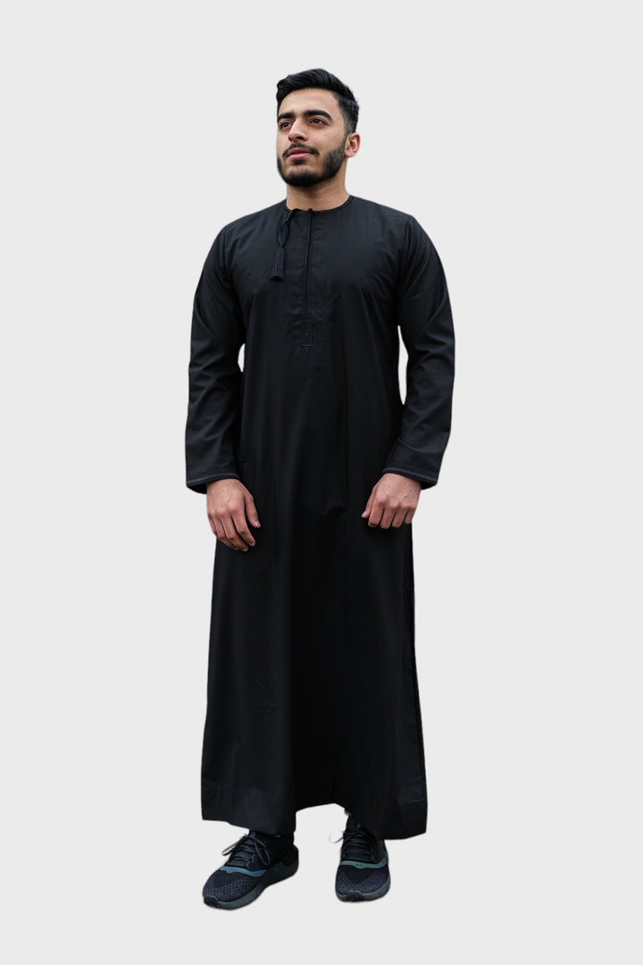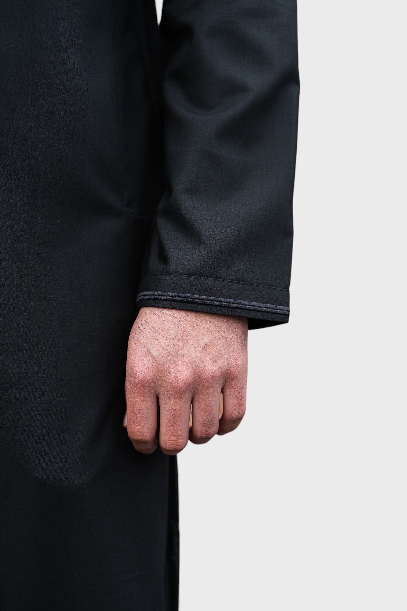 - Black Fabric: The thobe is made from high-quality Soft Polyester fabric, a colour that is both modern and striking.