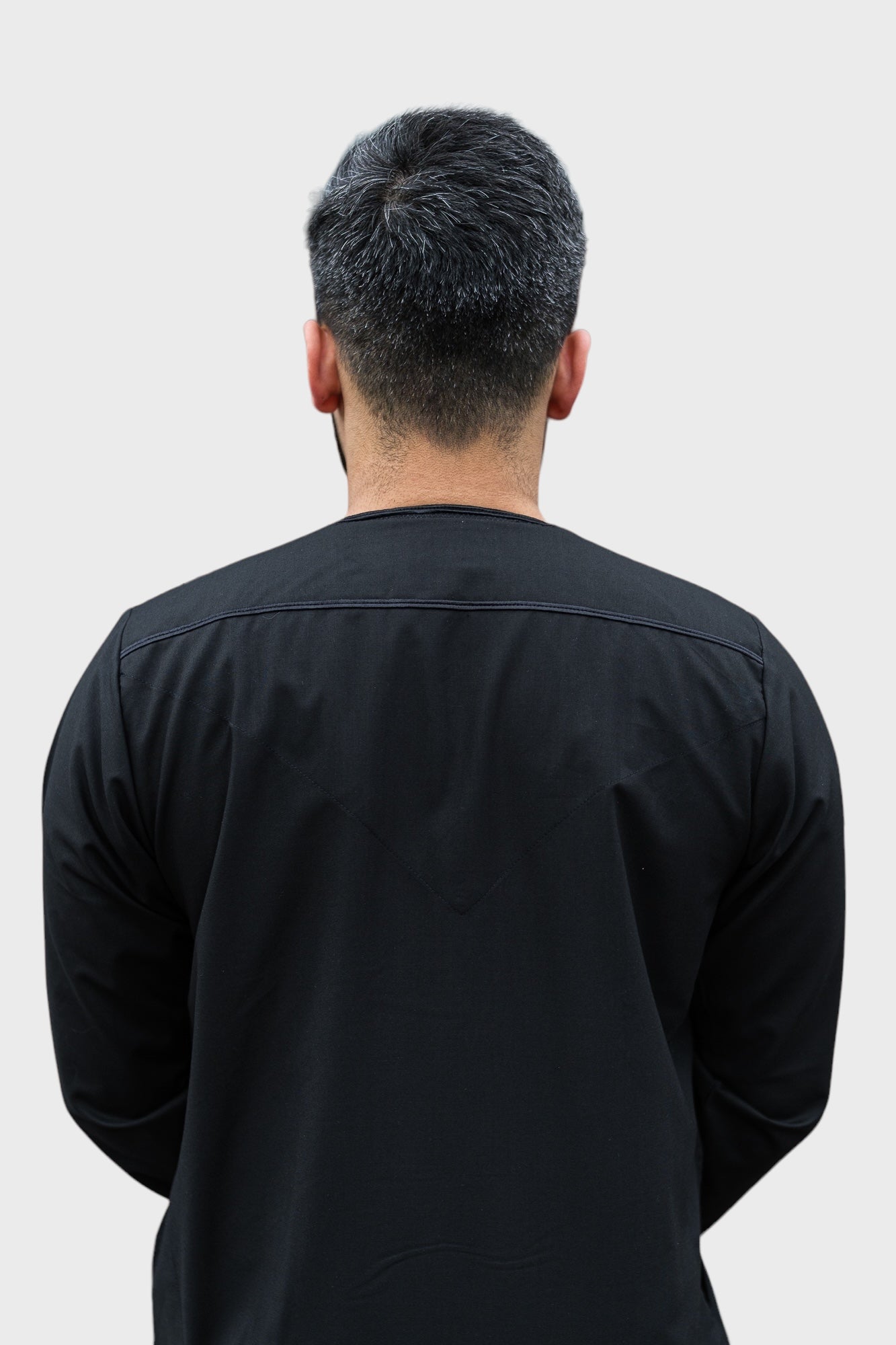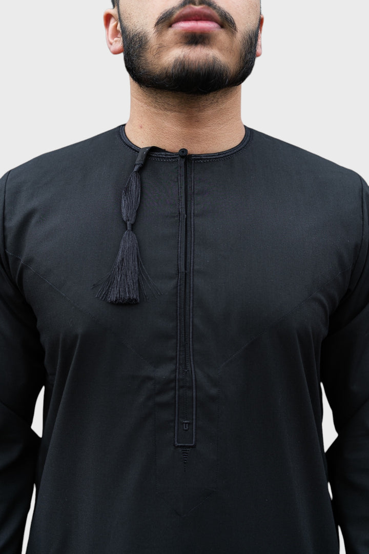 - Black Embroidery: The Black detailed embroidery provides a beautiful blend to the Black fabric, making the intricate patterns stand out and giving the thobe a vibrant and eye-catching look.