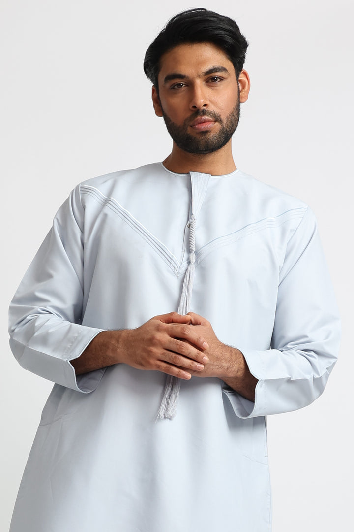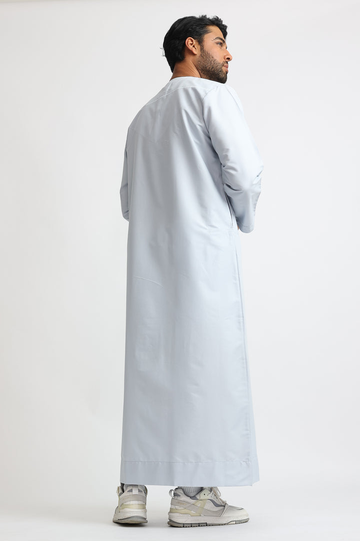 - Pale Blue Hue: The thobe's Pale Blue color exudes a sense of luxury and sophistication. This subtle yet striking shade is versatile, making it suitable for various occasions, from formal events to everyday wear.