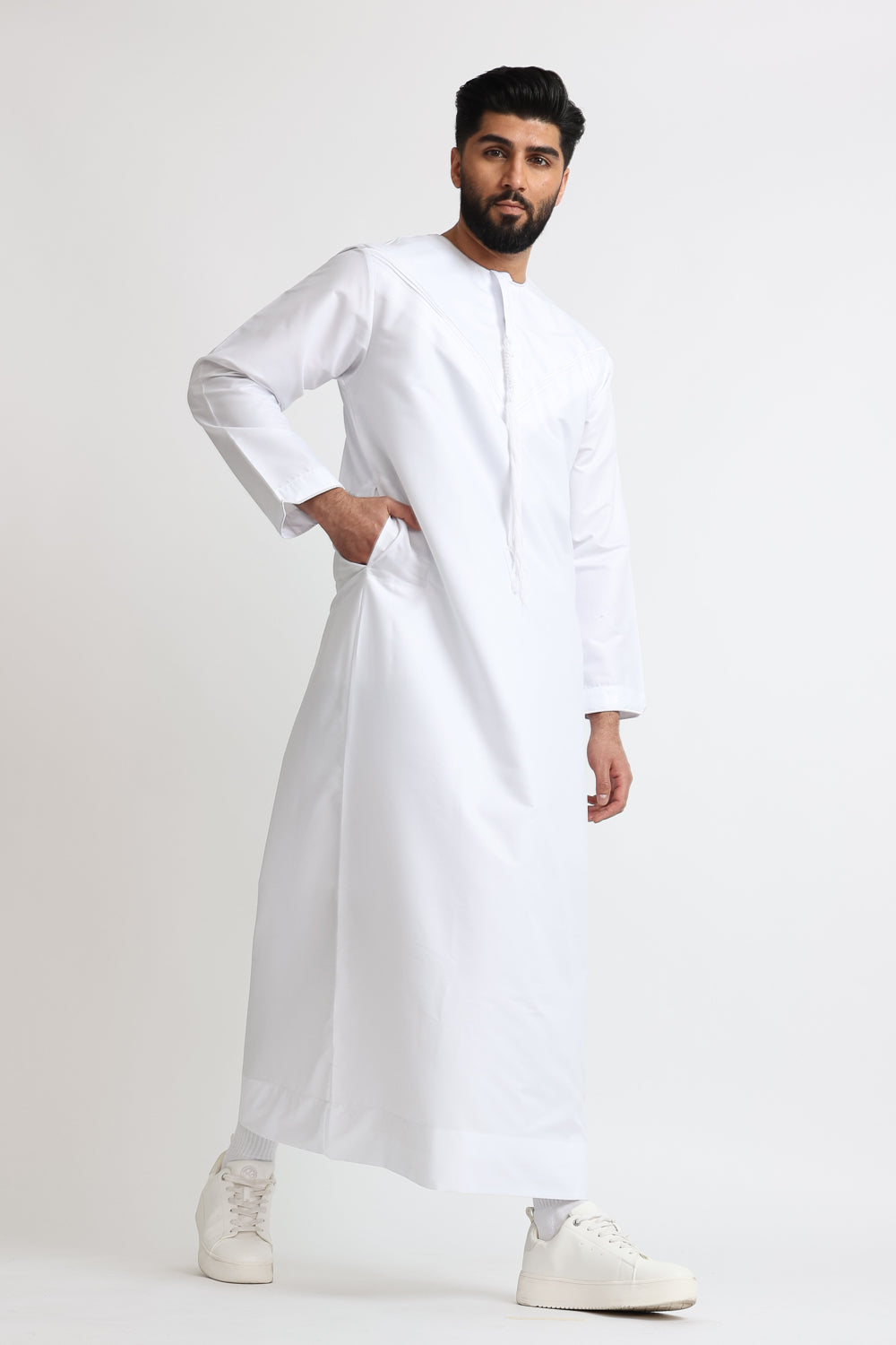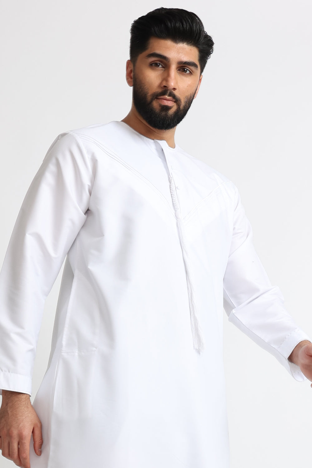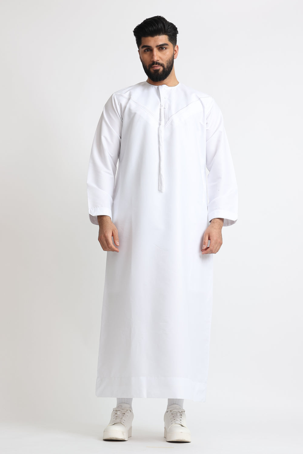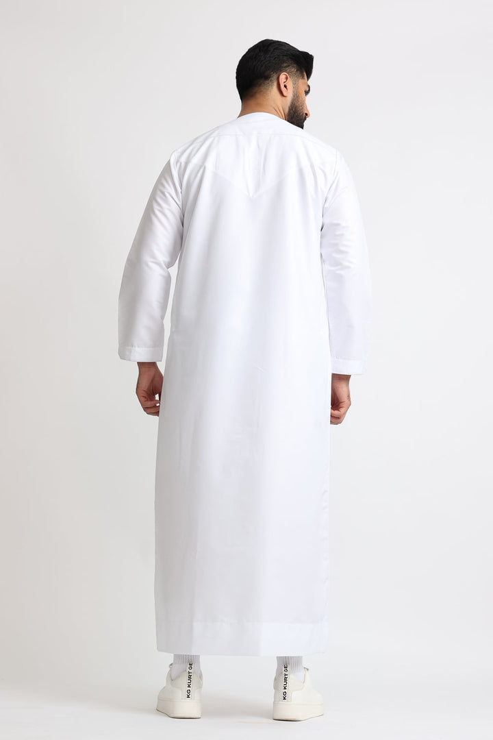 Elevate your style with the White on White Pleated Emirati Thobe. Designed for risk-takers, this Al Noor Thobe features intricate embroidery on its V-shaped. Made from super fine polyester, it boasts a detachable string for versatility. Make a statement with this daring and luxurious addition to your wardrobe!